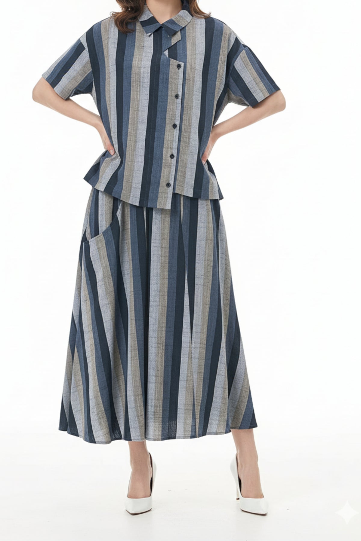 Our Aquamarine Striped Linen Coord Set is made for both comfort and style. The half-sleeve shirt features a vibrant striped pattern and a unique asymmetrical neckline. The matching skirt has a, easy-going fit and practical side and back pockets. The set is made from breathable linen, so it’s perfect for summer days.