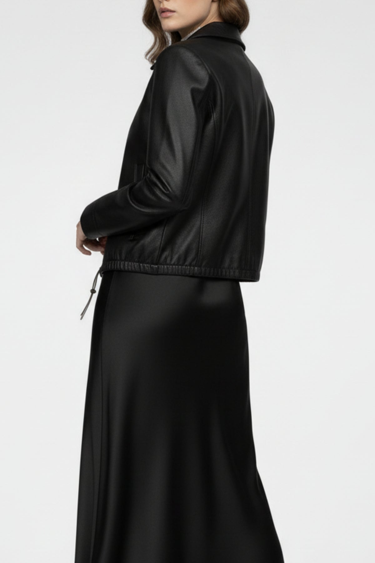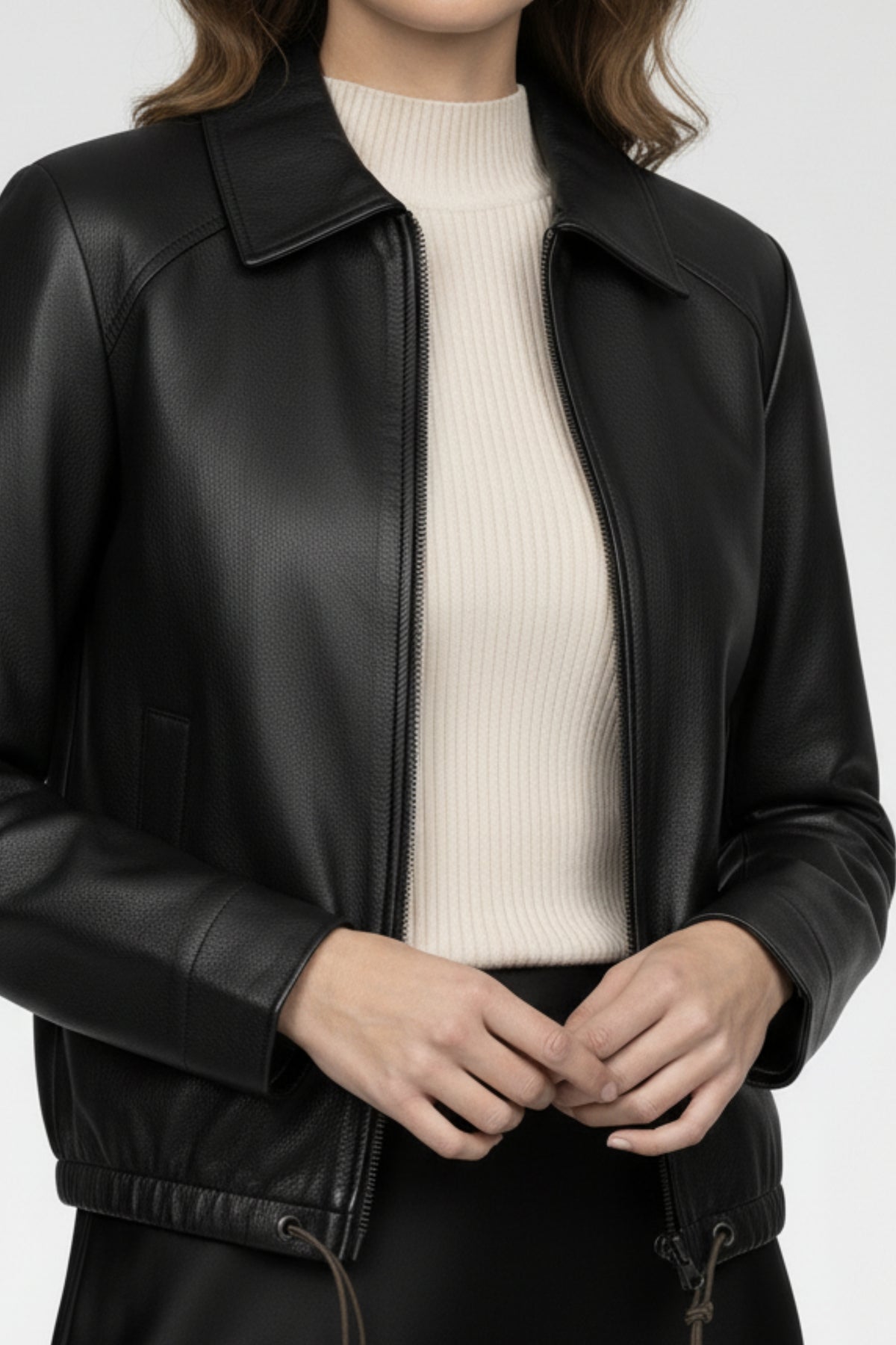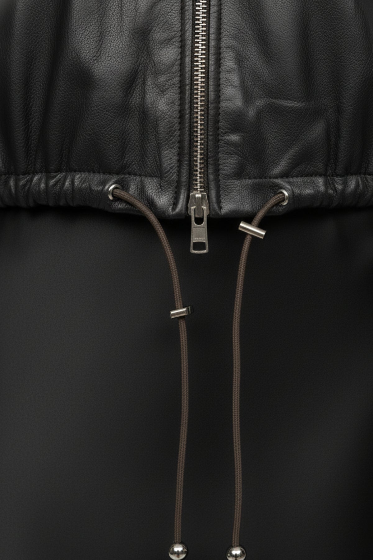 • Detail: Zippered Leather Jacket with adjustable drawstring hem