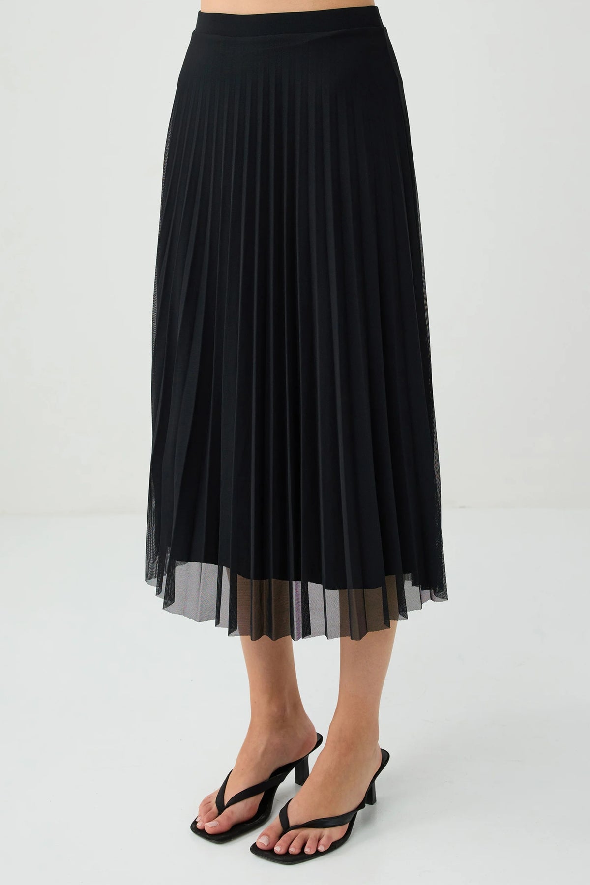 Effortlessly chic and beautifully lightweight, Midnight Mesh Pleated Skirt  is the perfect blend of elegance and comfort. Designed with a soft mesh overlay and finely pressed pleats, this skirt adds graceful movement and a flattering silhouette to any outfit.
