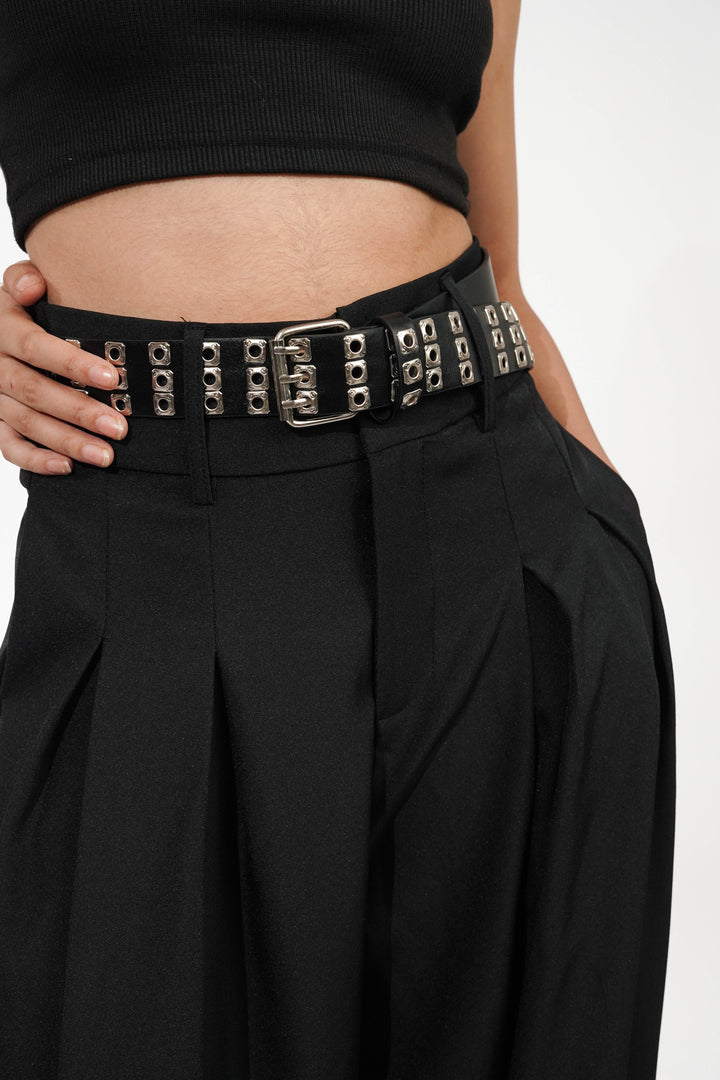 These Pin Drop Pleated Pants feature deep front pleats, side pockets, wide-leg structure, and scattered metallic safety pin-style accents that bring a punk twist to a clean silhouette. Finished with a high-rise fit and edgy hardware, these pants are equal parts bold and refined.
