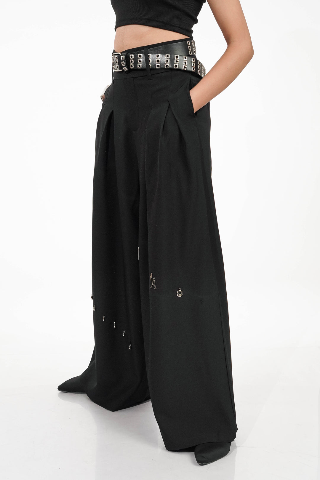 • Details: Black pleated pants with metal pin embellishments