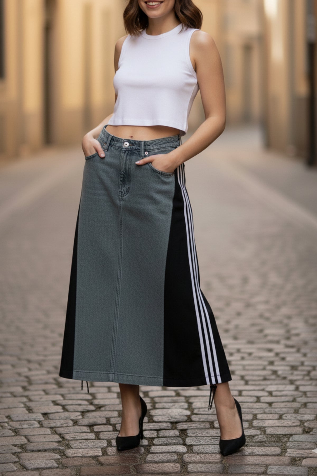 The Stripe Fusion Denim Skirt brings an edgy, upcycled vibe with its denim-meets-athleisure design. Featuring a denim front panel contrasted with sporty side stripes and adjustable zip details, this skirt stands out for its unique fusion of styles.
