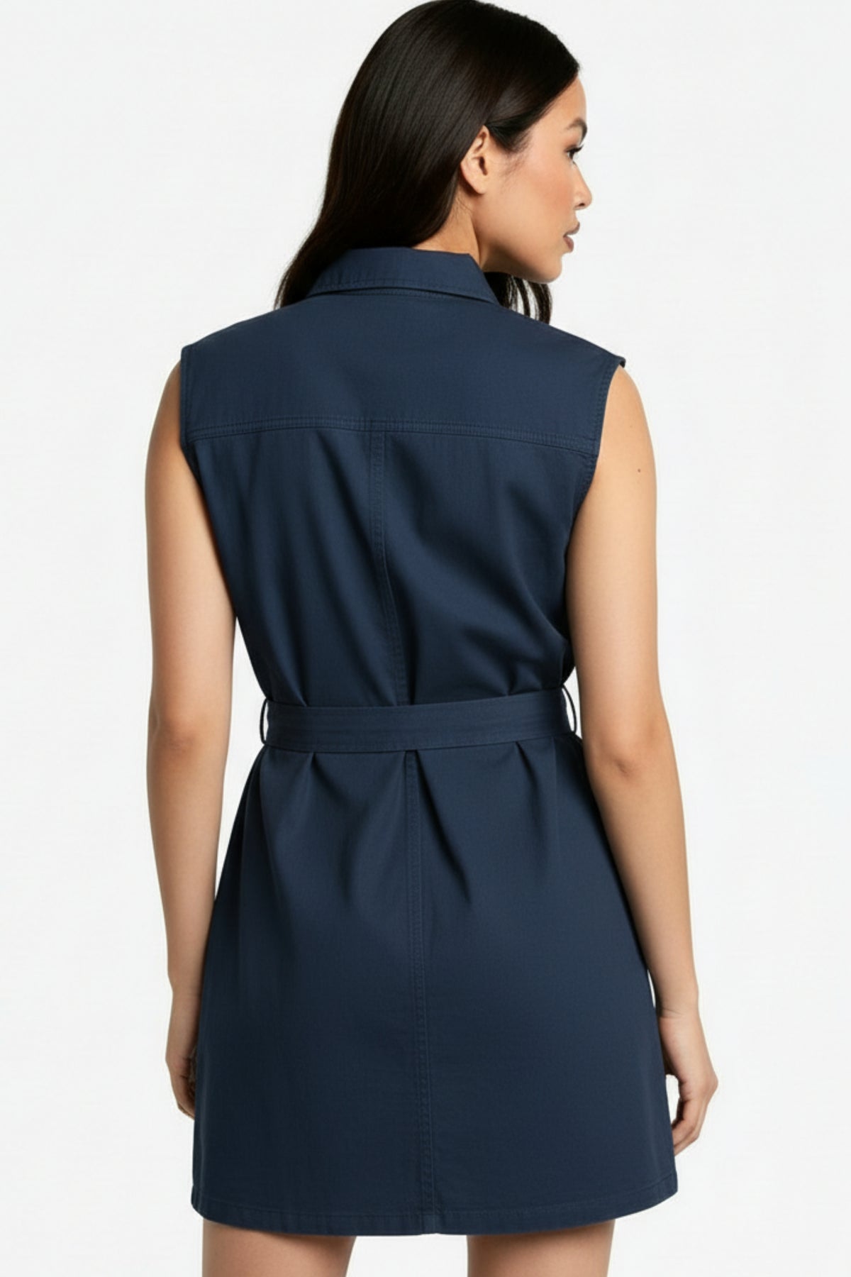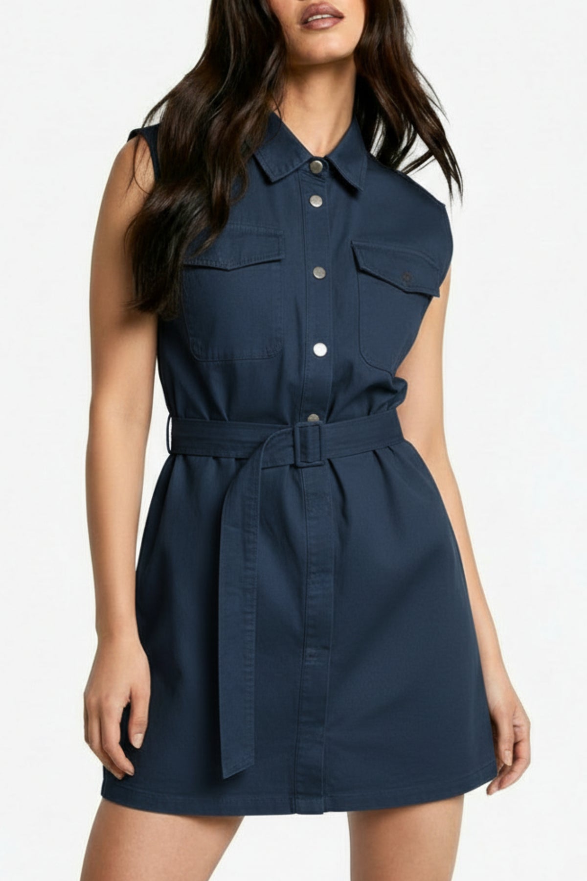 Effortless, structured, and undeniably chic — the Navy Blue Utility Belted Dress is your go-to outfit for days when comfort and style need to go hand in hand. Designed with a smart utility-inspired silhouette, this dress features bold flap pockets, a button-down front, and a flattering belted waist that adds shape while keeping the overall look relaxed and edgy.