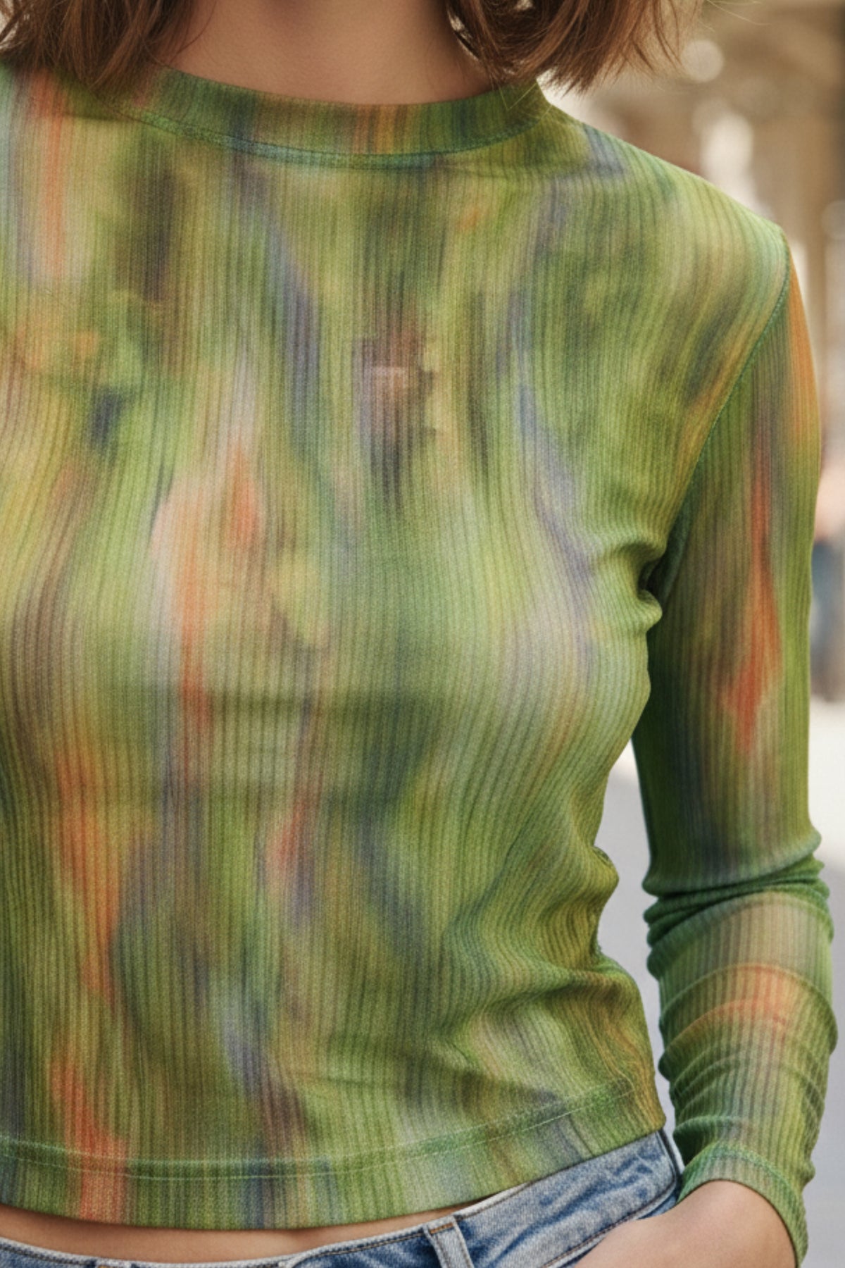 Add a soft pop of colour to your wardrobe with this moss green mesh top. Lightweight, breathable, and subtly sheer, it’s designed for effortless layering and modern everyday styling.