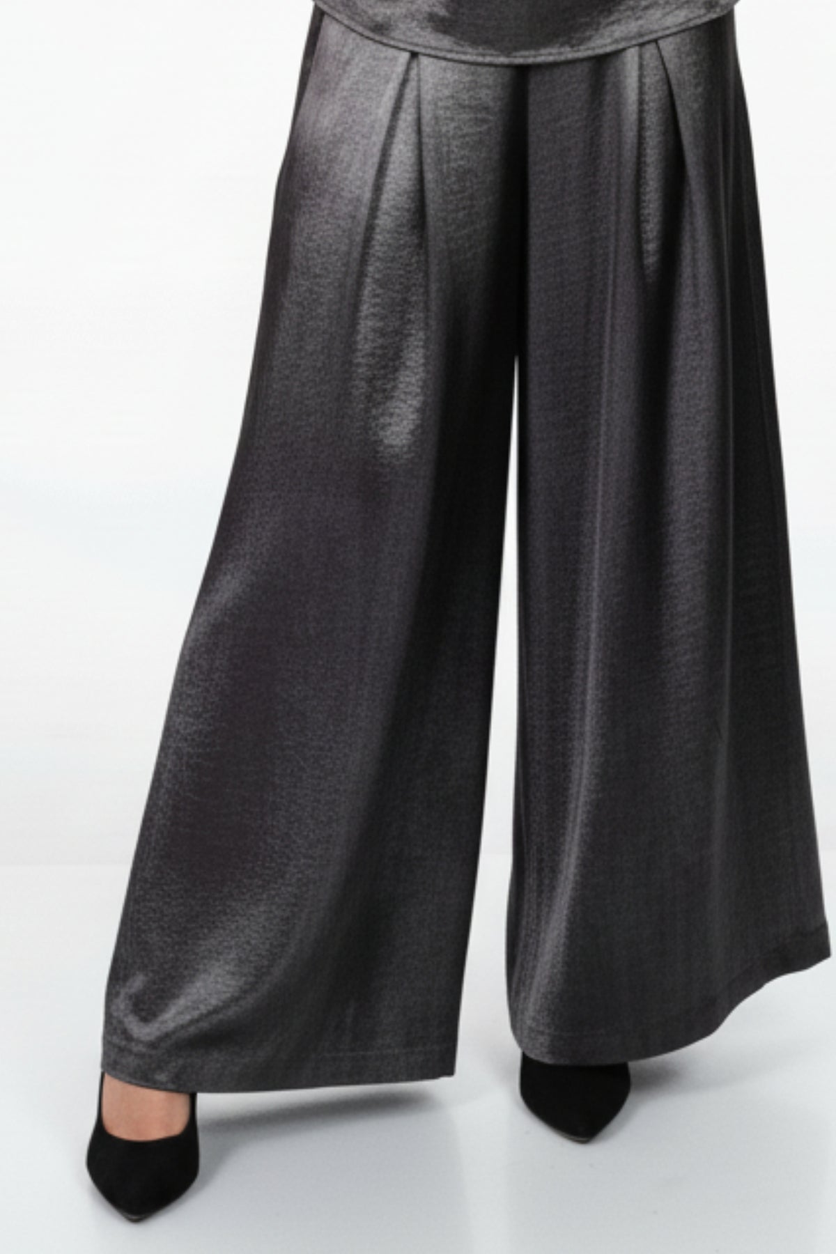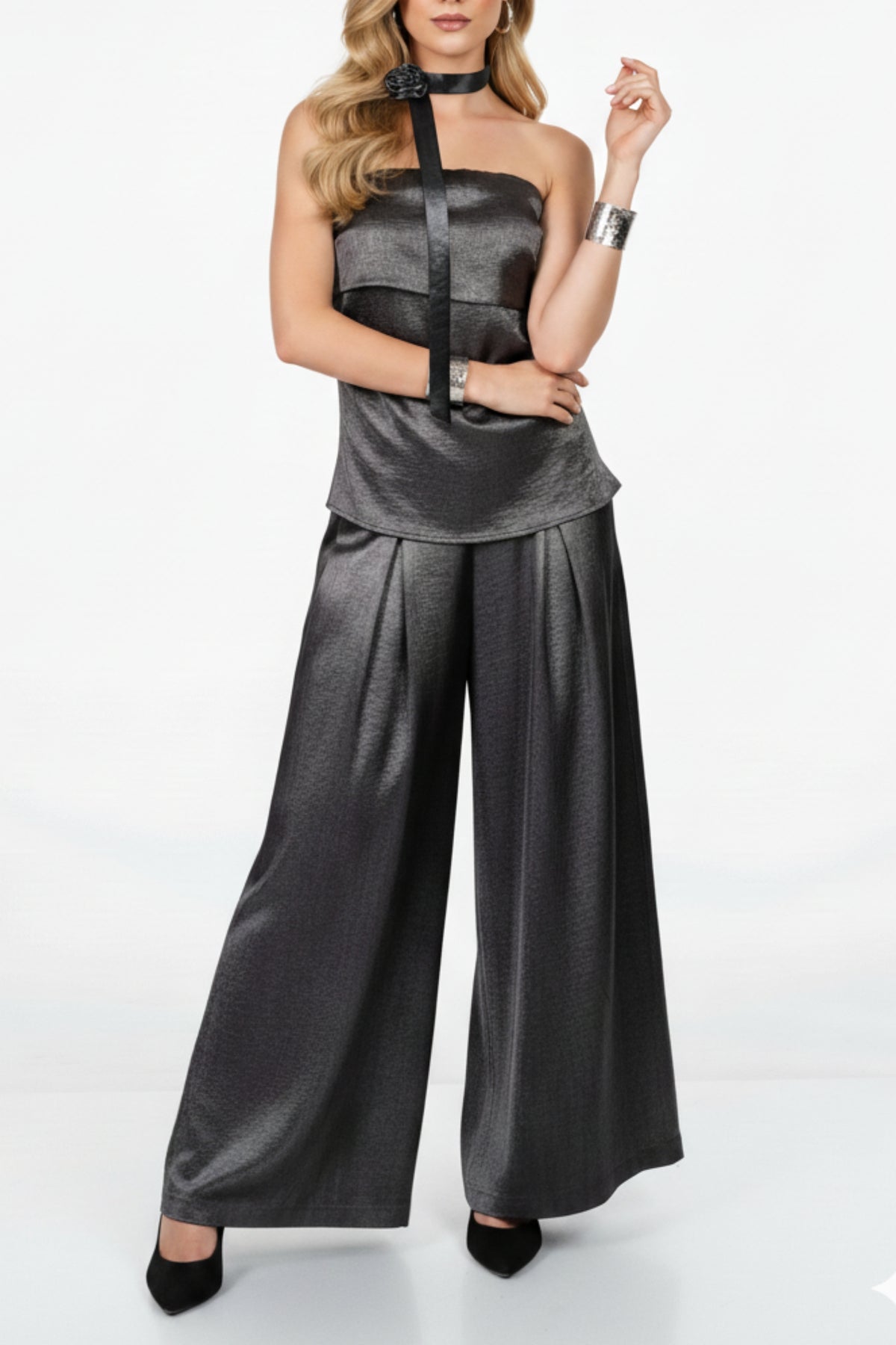Crafted from shimmering metallic fabric, this striking two-piece features a structured bandeau top with a silicone grip and an elasticated neckline for secure support. The matching wide-leg, high-waisted trousers offer a sleek yet fluid silhouette, with an elasticated back waistband for a customized fit. A coordinating neck tie adorned with a statement fabric rose adds an elegant touch with just the right amount of edge.