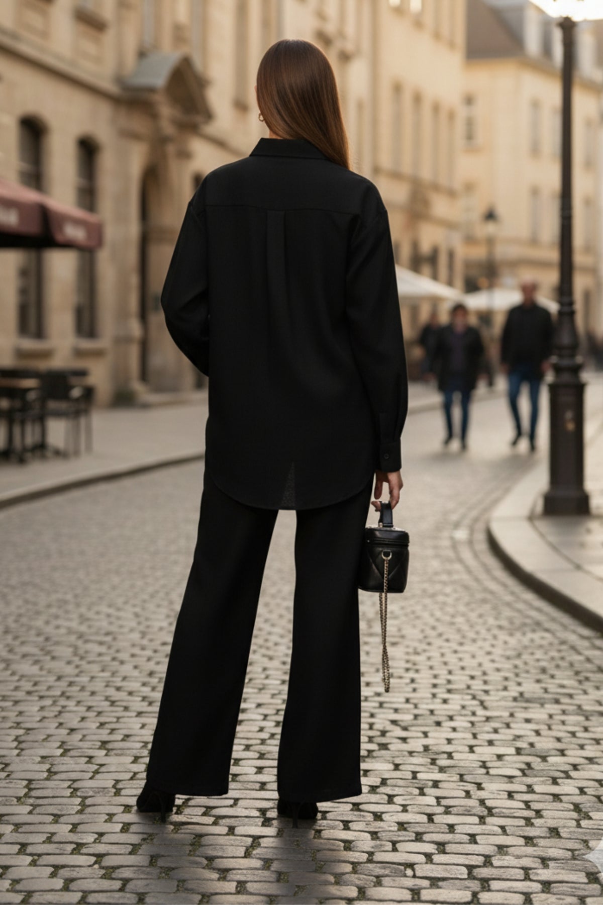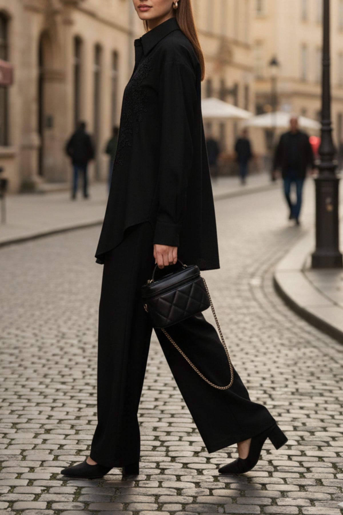 This Black Oak Embroidered Linen Co-ord set showcases a full-sleeve button-down shirt with a sharp collar, featuring intricate black-on-black thread and stone embroidery across the chest. Paired with coordinating wide-leg pants with an elasticated waist, the look is sleek, powerful, and perfect for understated elegance.