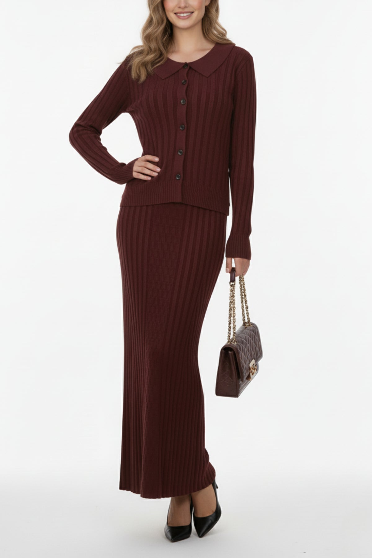 The Burnt Maroon Button Down Co-ord Set is where timeless sophistication meets modern minimalism. Crafted from soft rib-knit fabric, this elegant two-piece set features a button-down top with a classic collar and long fitted sleeves, paired with a matching ribbed midi skirt that flows gracefully with every step.