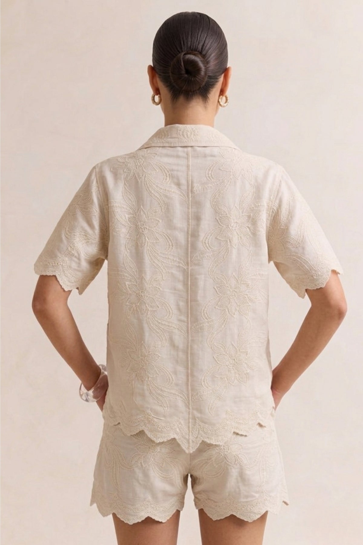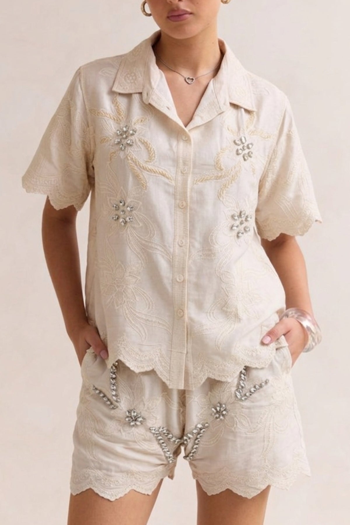 Feel rich and fashionable in the ButterCream Embellished Shorts Co-ord Set. It features a beautiful scalloped shirt, which is heavily embroidered and adorned with rhinestones and glass beads. It is paired with cute scalloped shorts.
