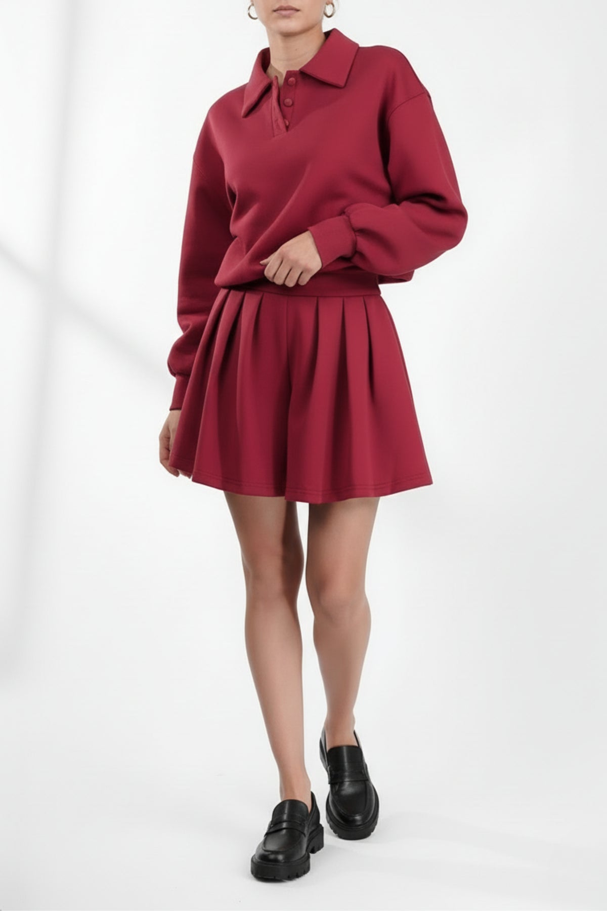 Catch everyone’s attention with the athleisure-inspired Cherry Red Bermuda stylish co ord sets for women. The full-sleeve top features a classic collar, cuffed wrists, and fabric-covered buttons for a poised look. The elasticated bubble hem adds shape and style. The matching shorts come with a belted waist, knife pleats, and front and back detailing, which offers a comfortable fit.