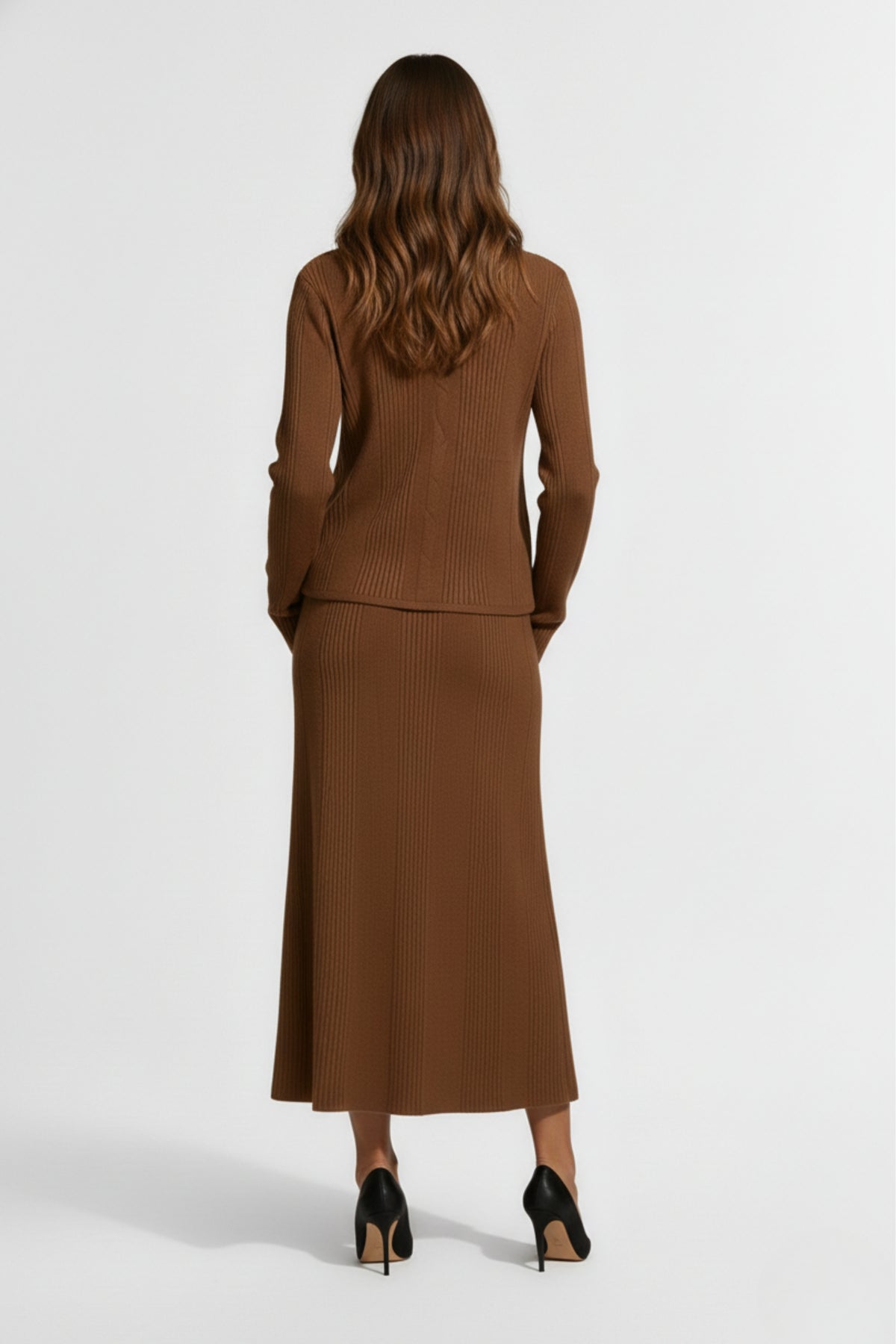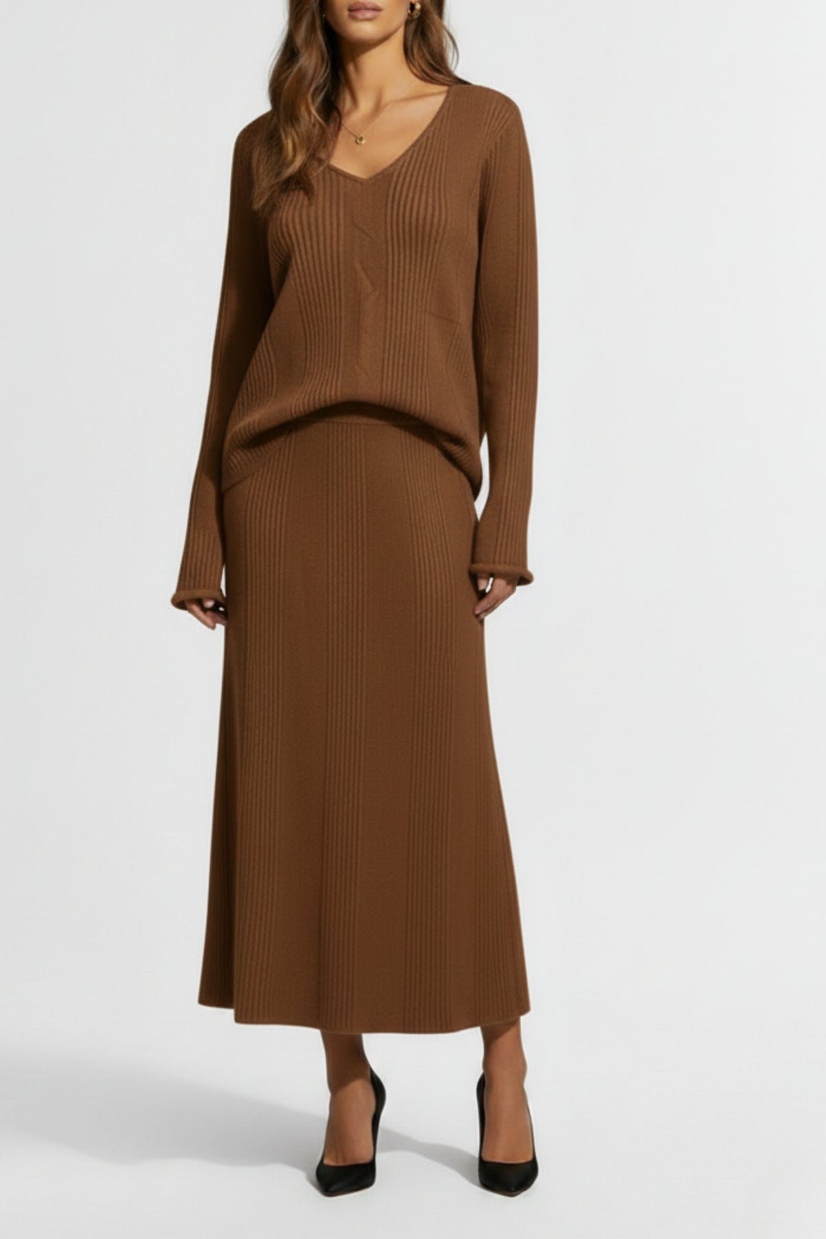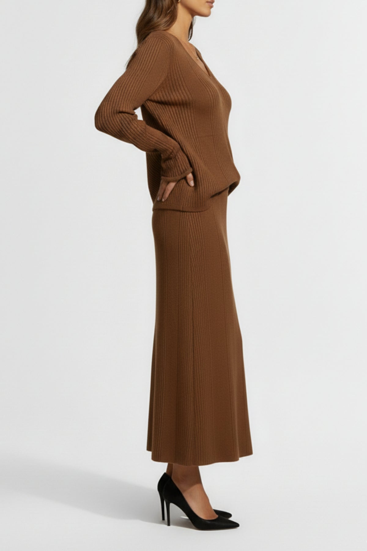 The Mocha Ribbed Skirt Co-ord Set, designed for both sophistication and comfort. This co-ord features a long-sleeved rib-knit top with a soft V-neckline and subtly flared cuffs, paired with a matching midi ribbed skirt for a seamless, elegant silhouette.