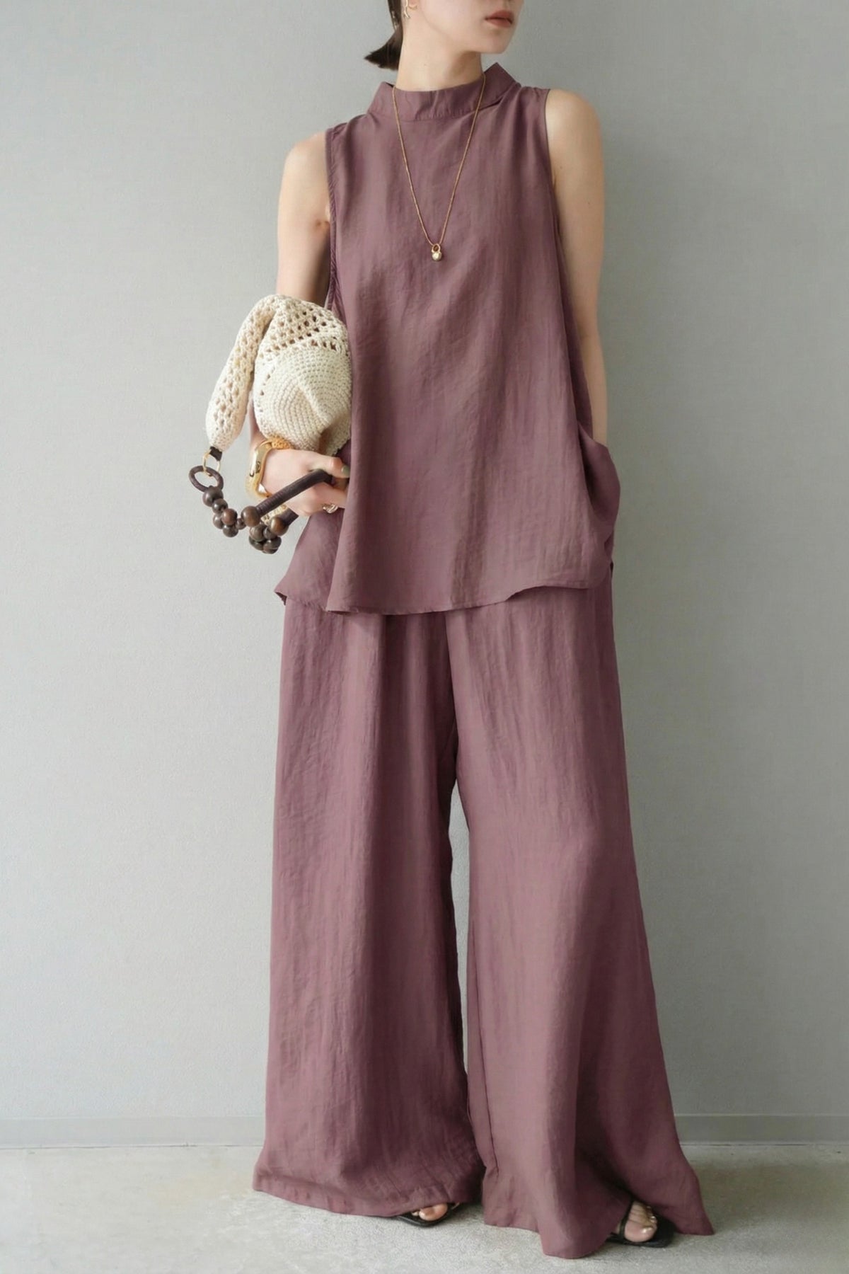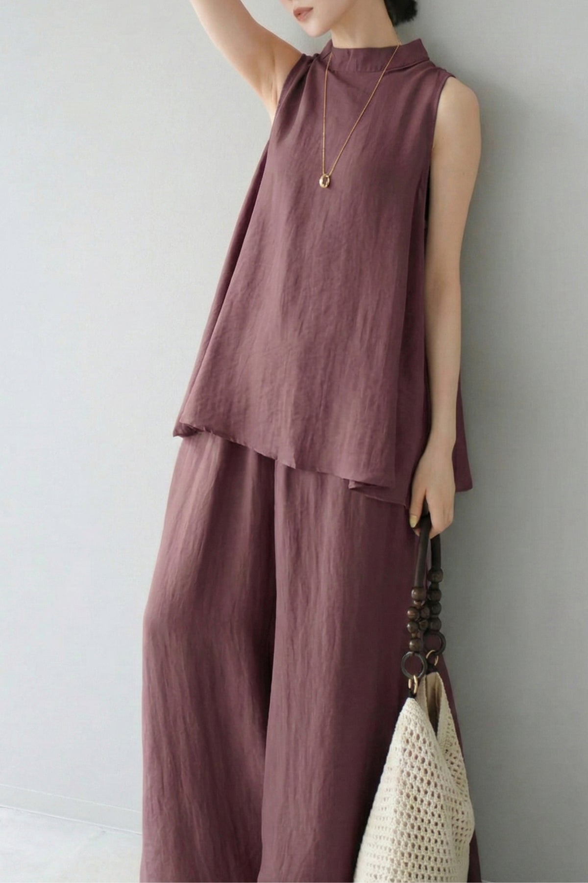 The Plum Purple  Back Slit Comfort Co-Ord Set combines ease and style in a minimal silhouette. Featuring a sleeveless top with a chic back slit and wide-leg elasticated pants, this set is designed for effortless movement and all-day comfort.