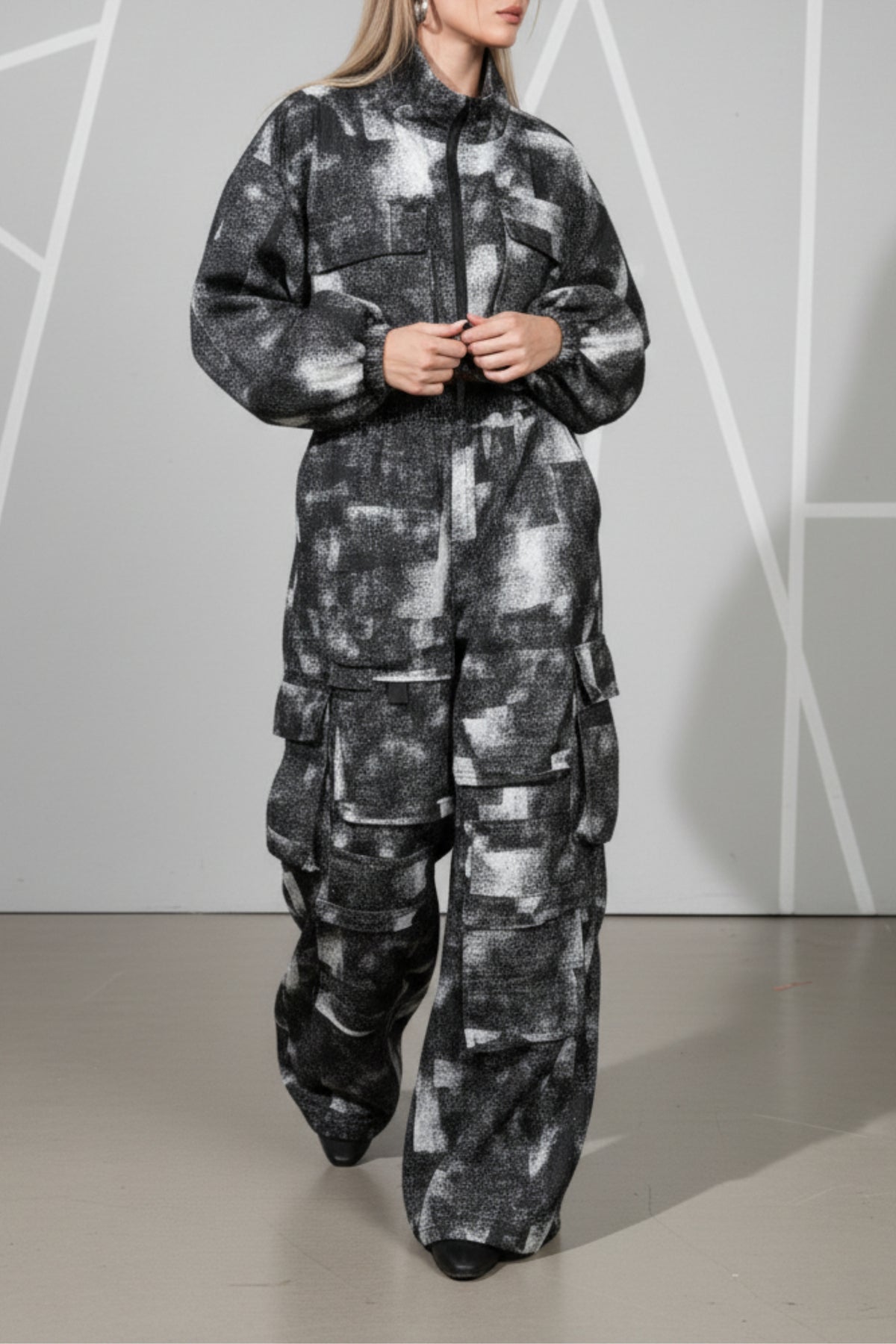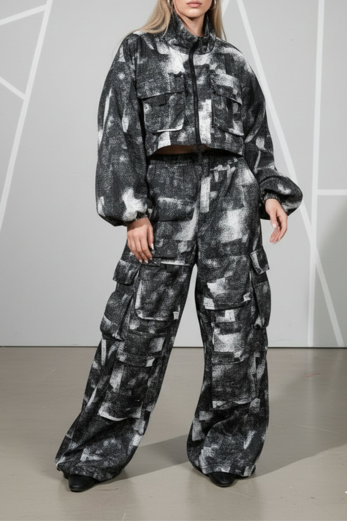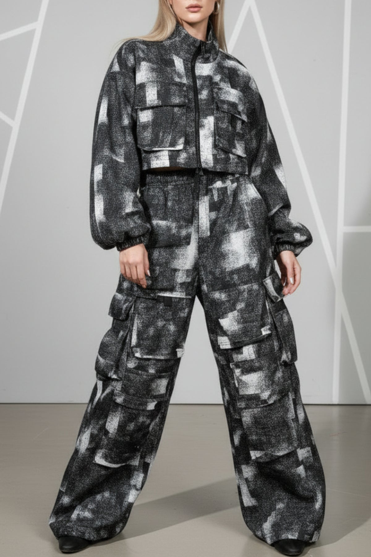 Step into streetstyle supremacy with the Urban Mono Co-ord Set – a statement-making blend of function and fashion. This monochrome utility set features a cropped oversized jacket and wide-leg cargo pants, both finished in an abstract grayscale print that’s bold yet wearable.