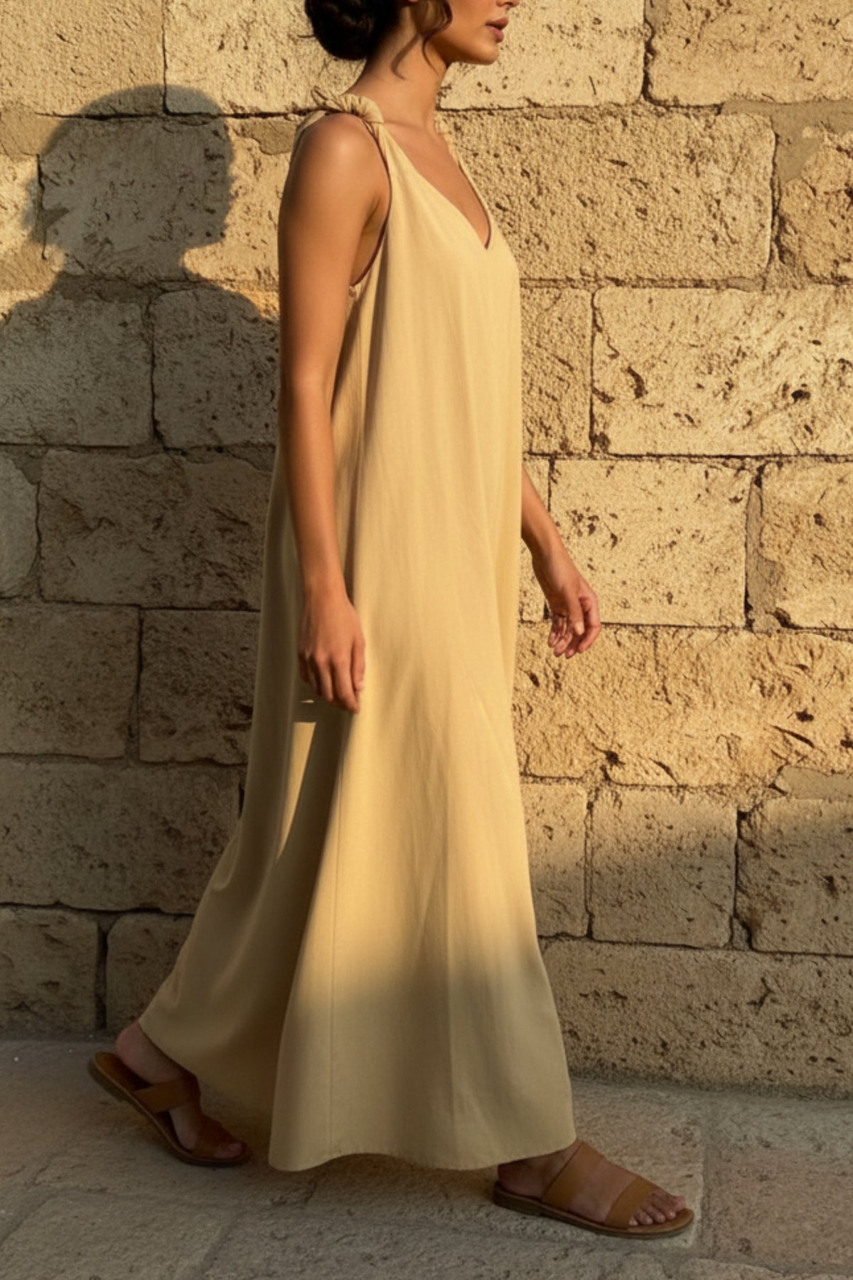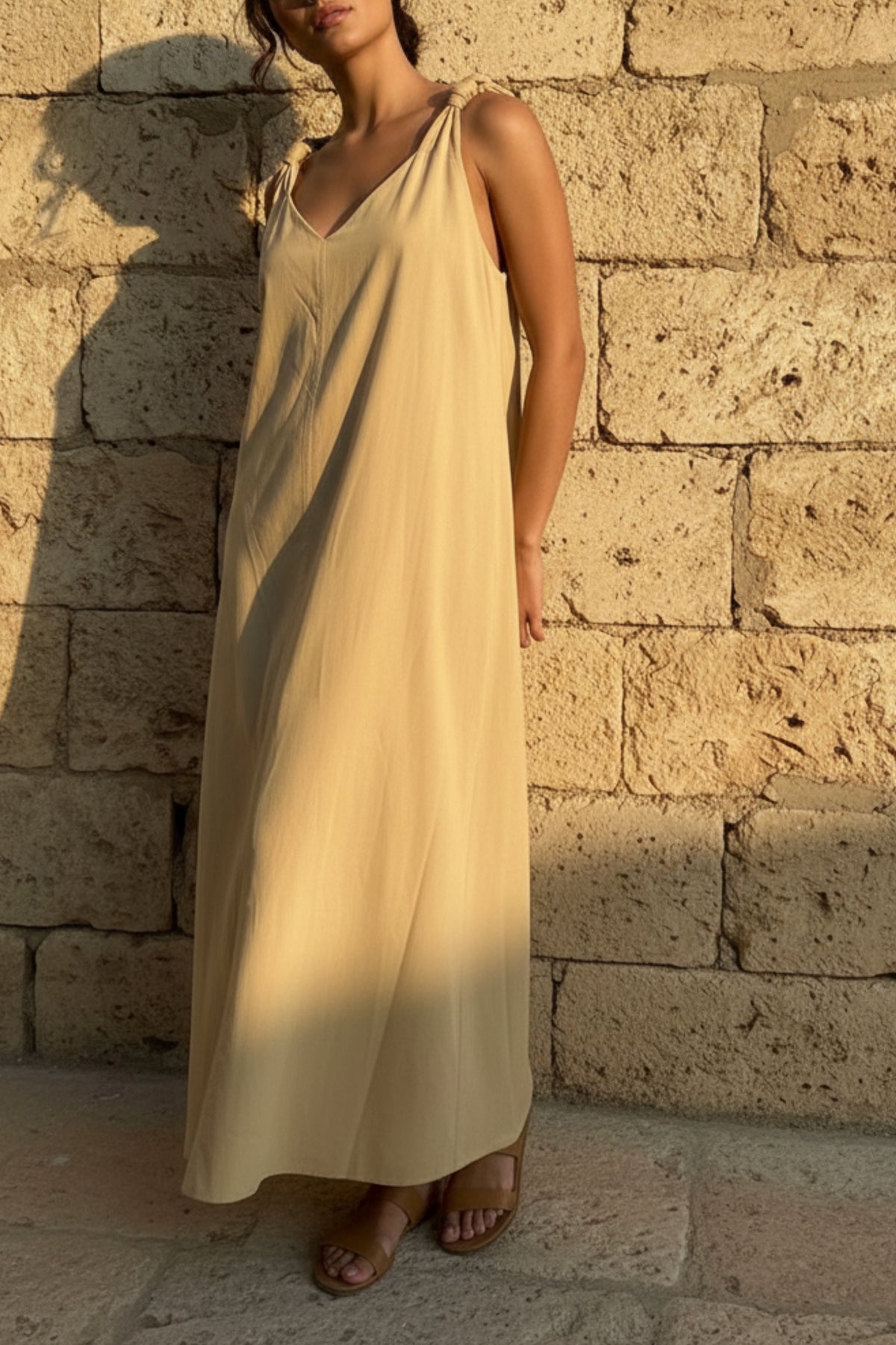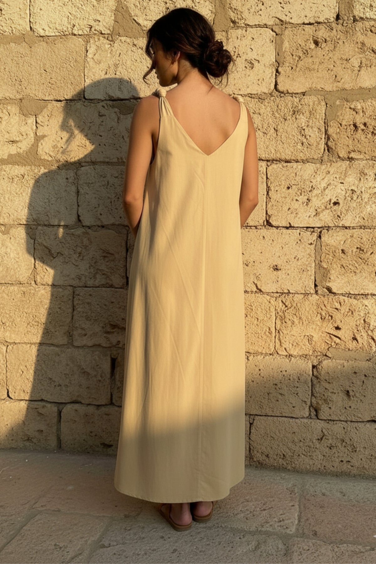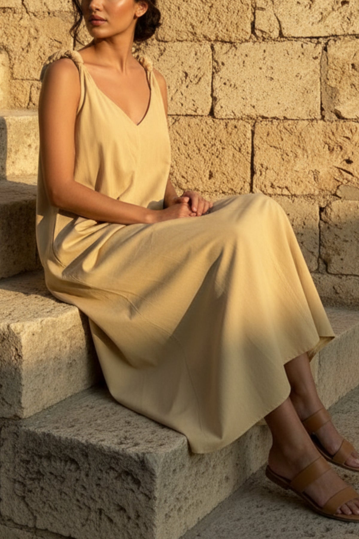Effortlessly elegant with a soft, fluid silhouette, the Candlelight Twist Dress is designed for understated sophistication. Featuring twisted shoulder straps and a graceful V-neckline, this dress drapes beautifully, making it a timeless choice for warm days and relaxed evenings.