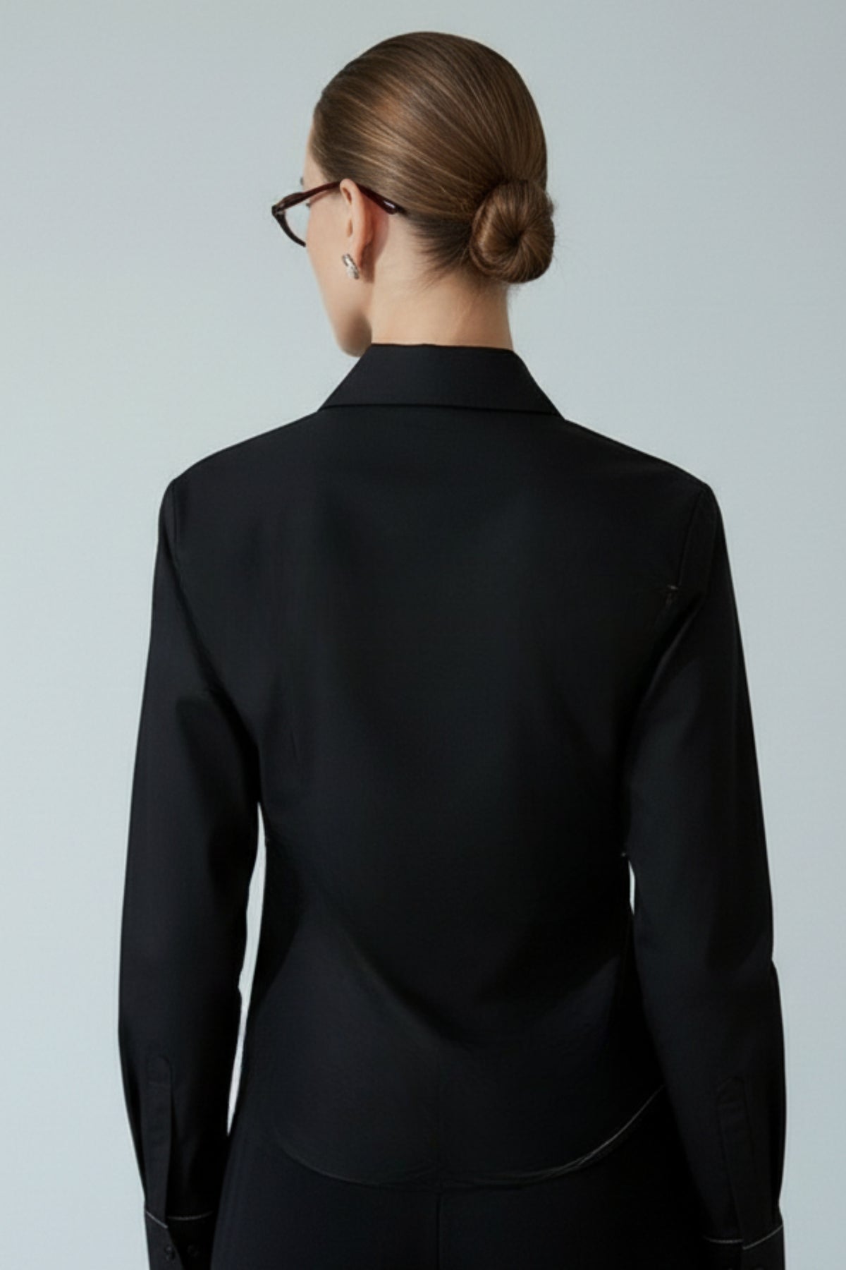 Sharp, sultry, and effortlessly cool — this Bralette Pattern Black Shirt takes classic tailoring and adds an unexpected twist. Featuring contrast topstitching and mock harness-style strap details shaped like a bralette, it channels utility-core meets street luxe.