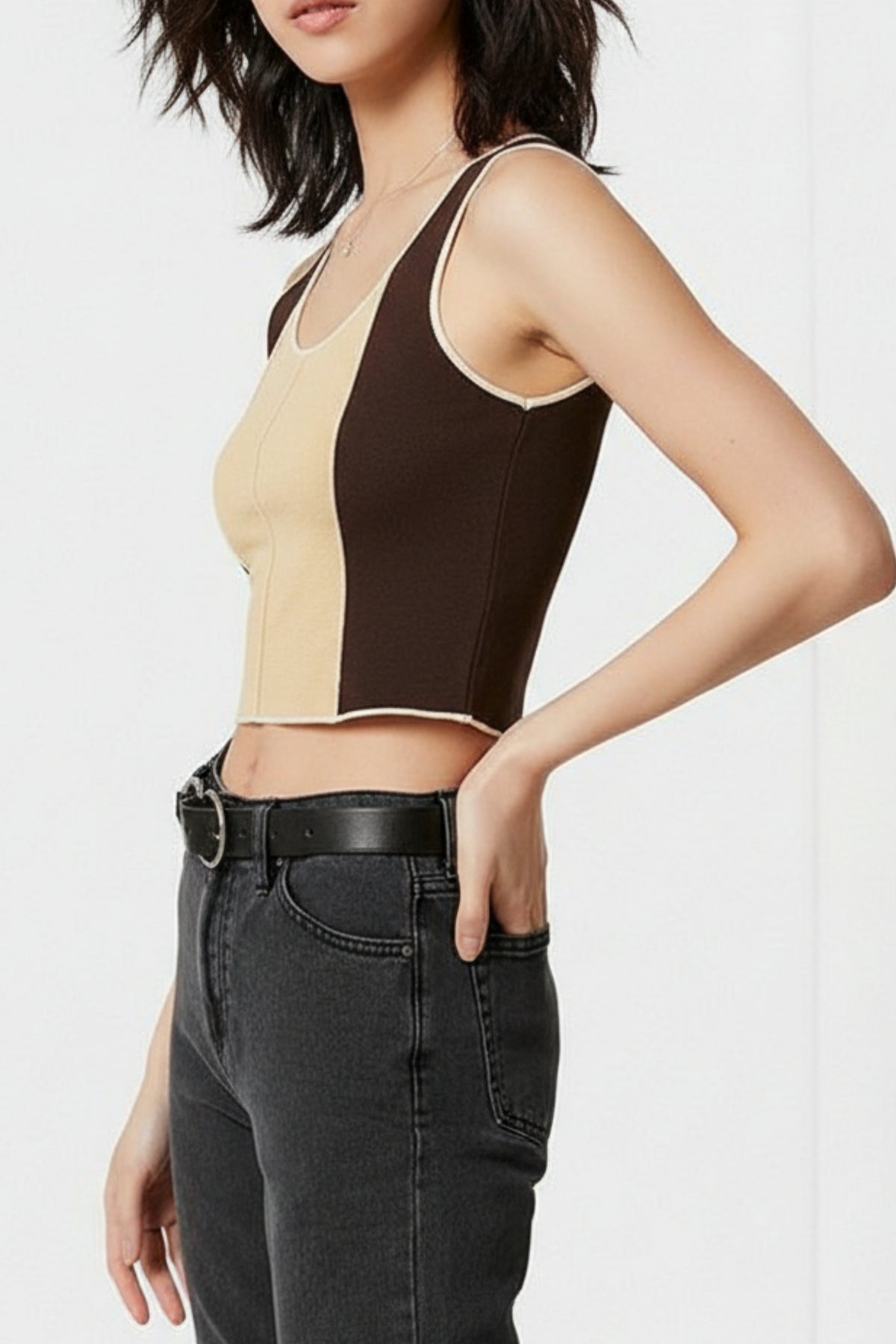 The Pecan Brown Knitted Top presents a sleek, sleeveless style in brown, skillfully designed to complement the body's contours. Delicate white inlock stitch detailing embellishes the edges, while a contrasting patch at the center introduces a contemporary touch of sophistication and depth.