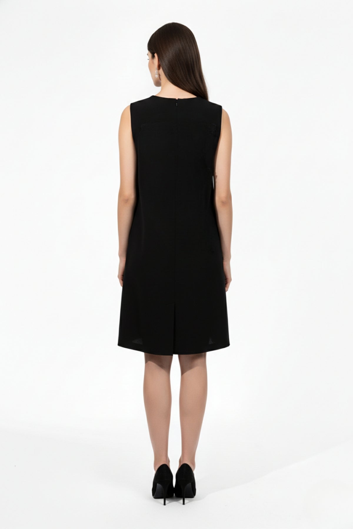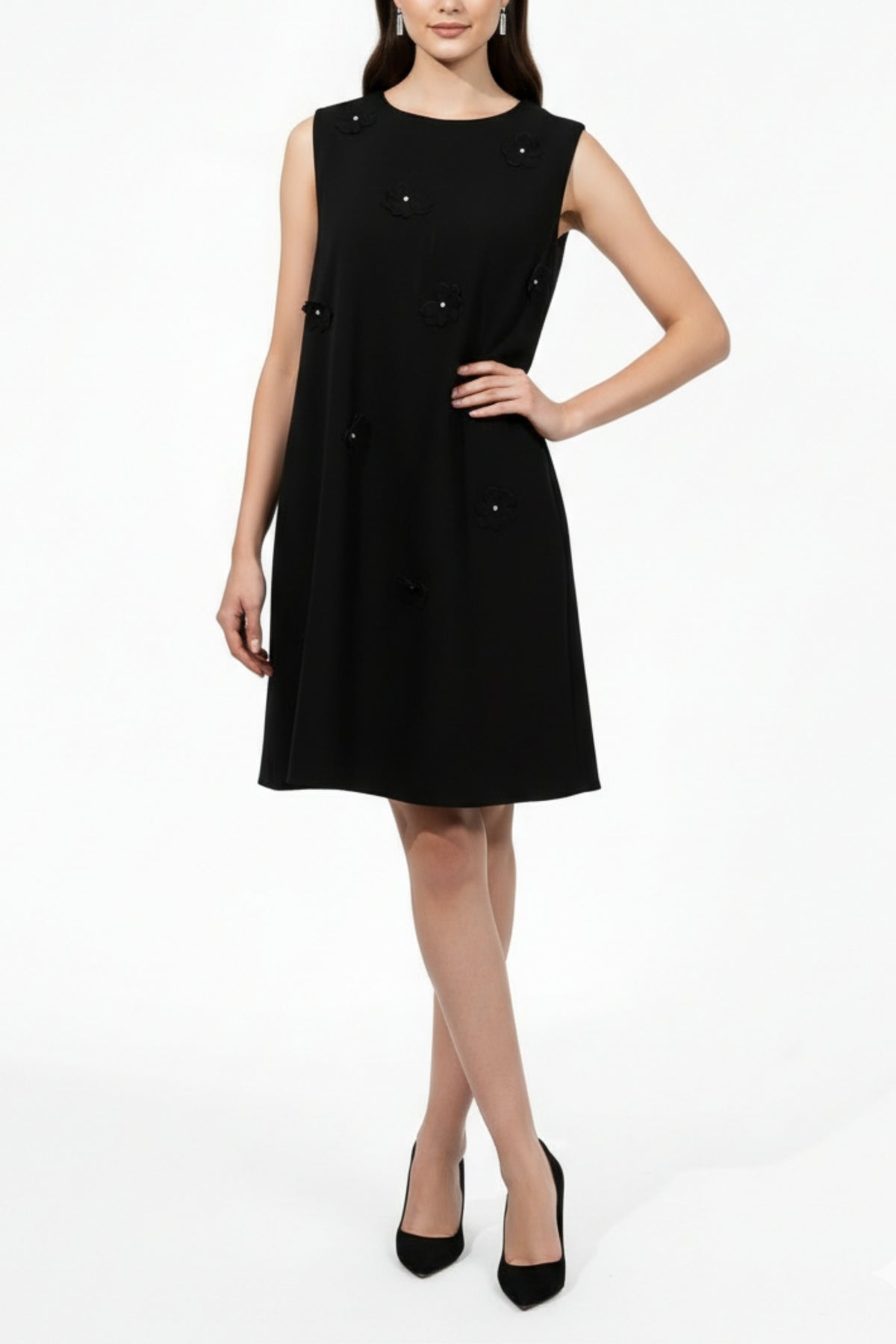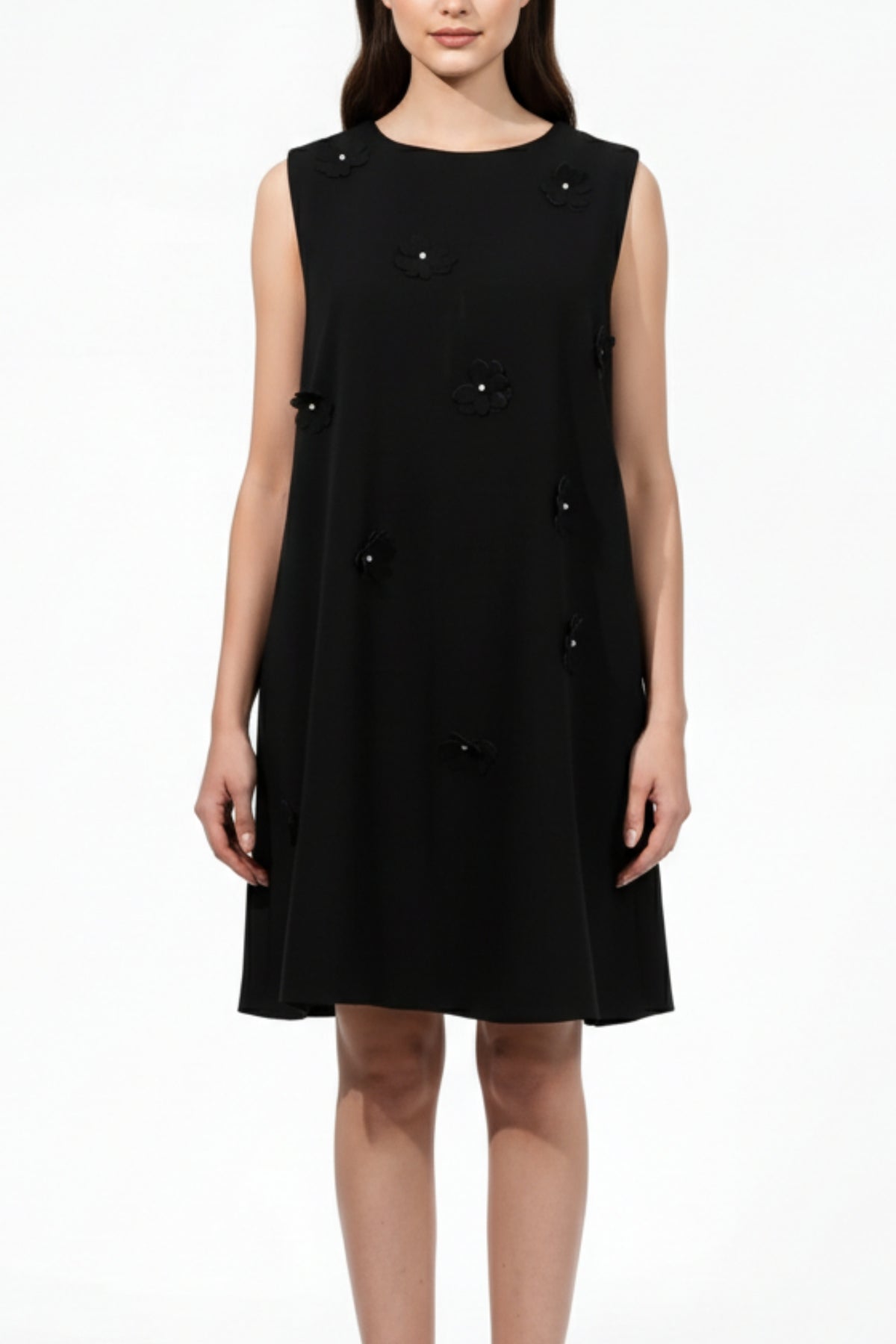 Make a bold fashion statement with this Adelaide Black Floral Dress, featuring a round neckline and a trapeze/flared silhouette adorned with 3D applique flowers and pearl embellishments. Crafted from premium-quality fabric, the flared silhouette ensures a flattering drape, making it a versatile choice for various occasions. It features side pockets and a back zipper for a comfortable fit.