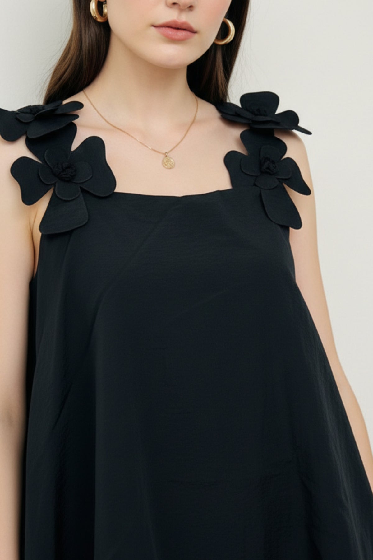 Playful, chic, and effortlessly statement-making — the Black Floral Bubble-Hem Dress is designed for women who love bold silhouettes with feminine detailing. This dress features a voluminous bubble hem that creates a soft sculpted shape, giving it a modern, fashion-forward feel.The shoulders are adorned with 3D floral appliqués, adding a romantic touch that elevates the minimal black base.