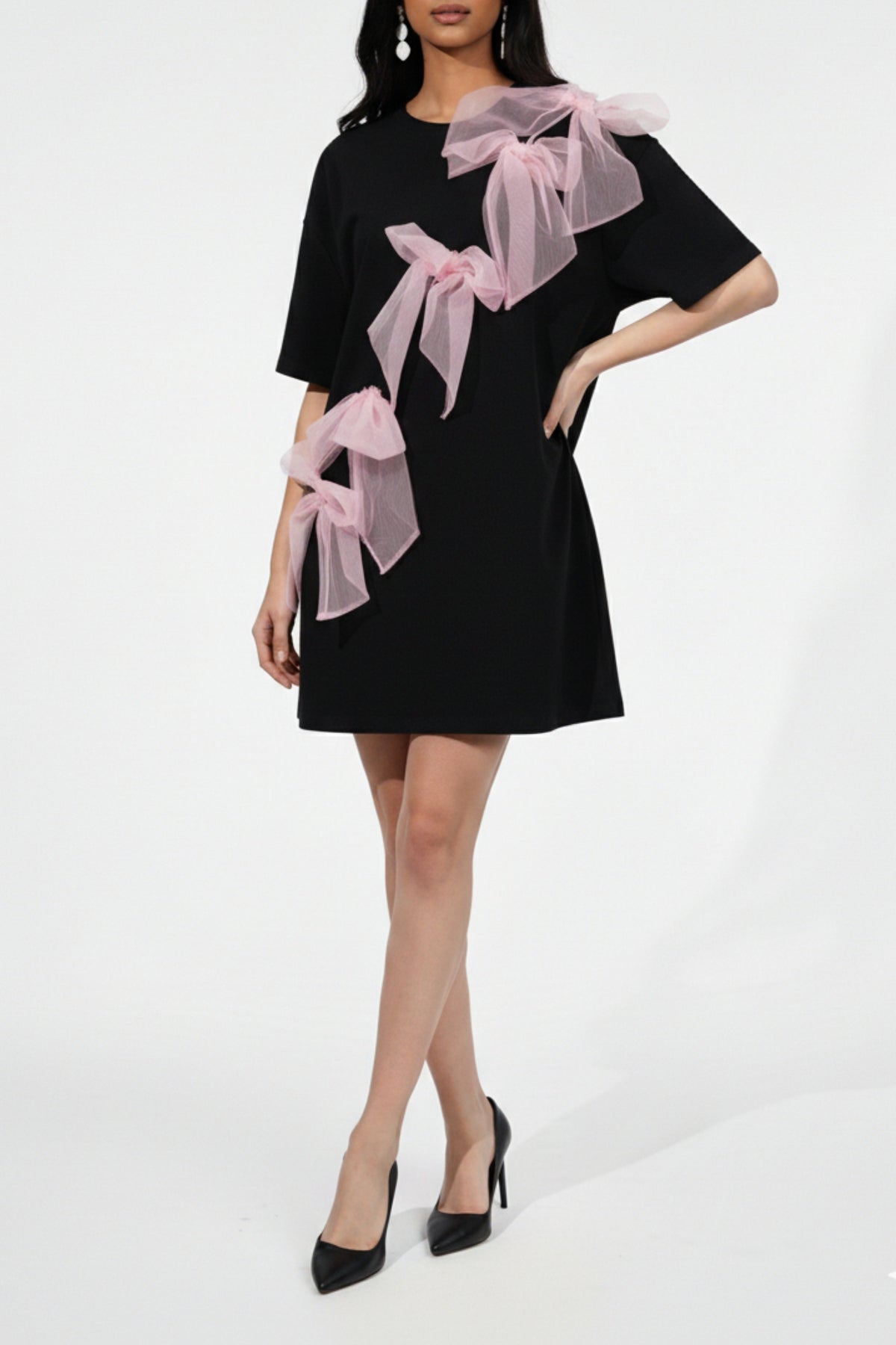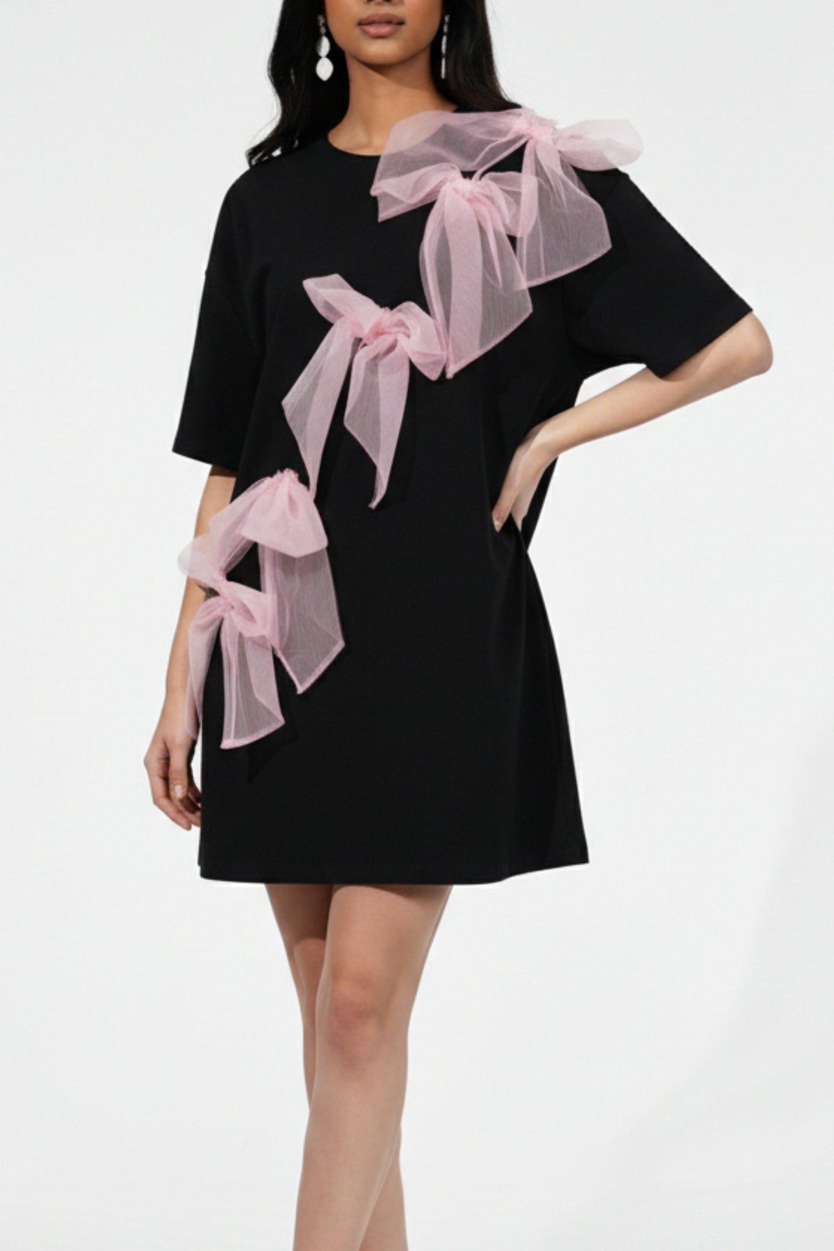 The Bonita Bows Black T-Shirt is a playful twist on a wardrobe essential. Crafted from a soft cotton-blend fabric, it features an oversized fit with short sleeves for everyday comfort. Eye-catching pink bows in organza & net, diagonally placed across the front along with slight cutouts that add a unique & feminine charm.