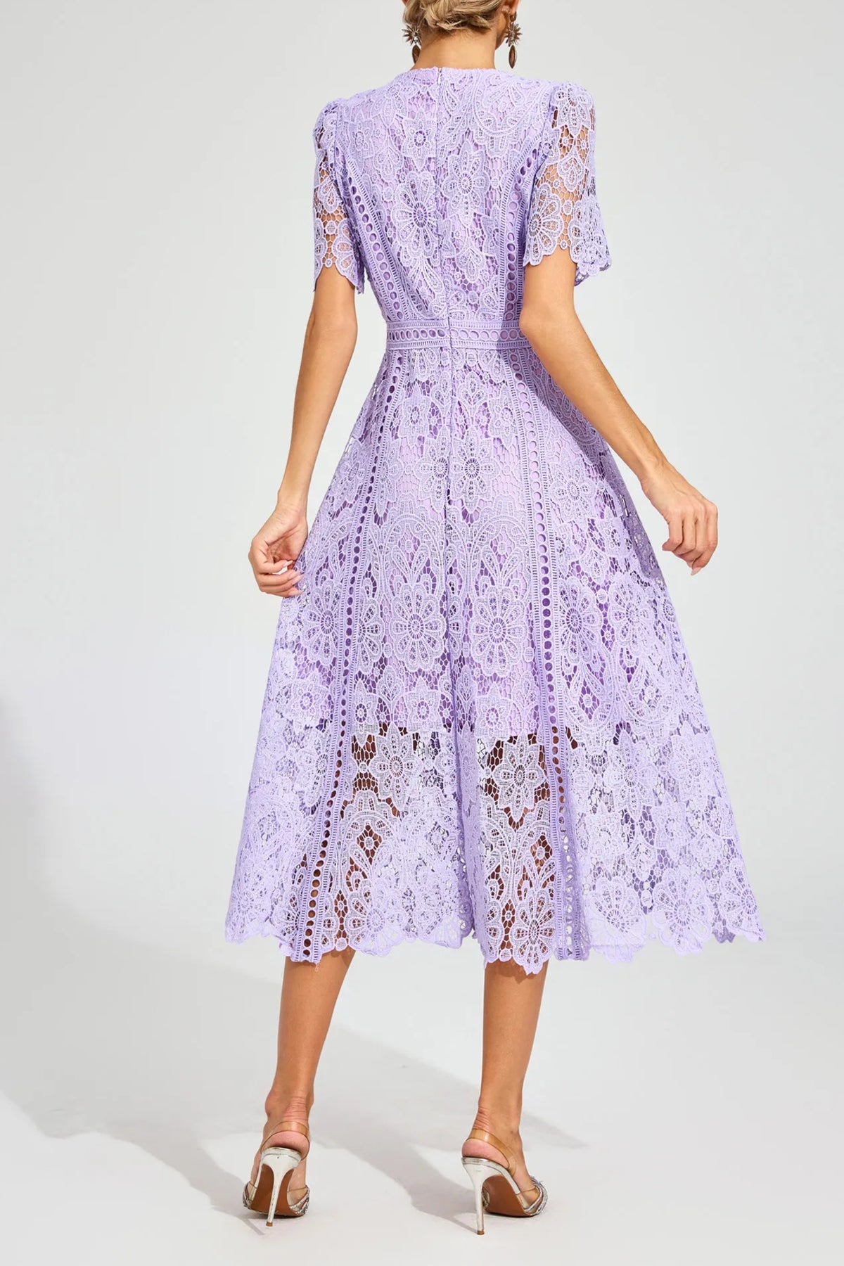 Delicate and feminine, the Lilac Verona Lace Dress is crafted to make every occasion feel special. Designed in a soft lilac hue, this midi dress features intricate floral lace throughout with elegant openwork detailing that creates a refined, romantic look.