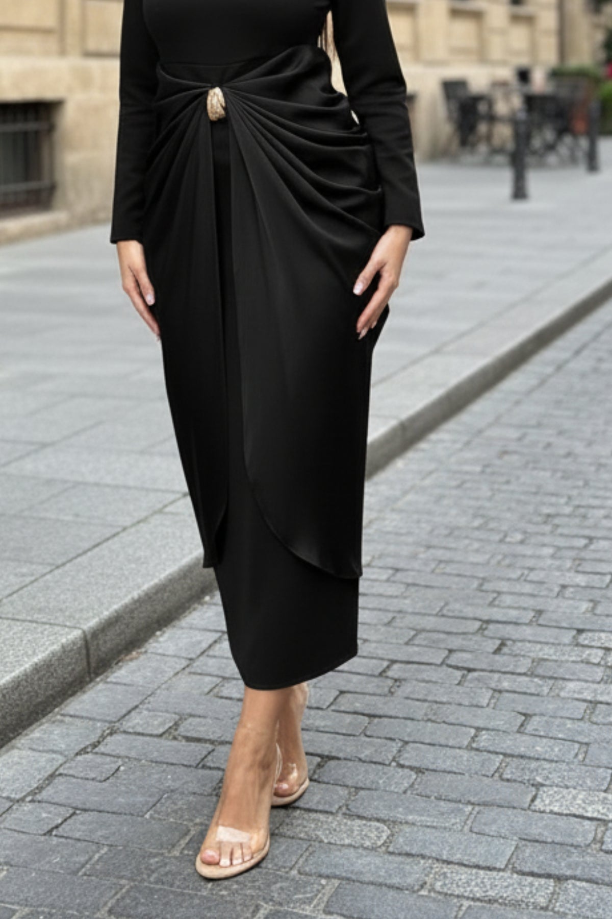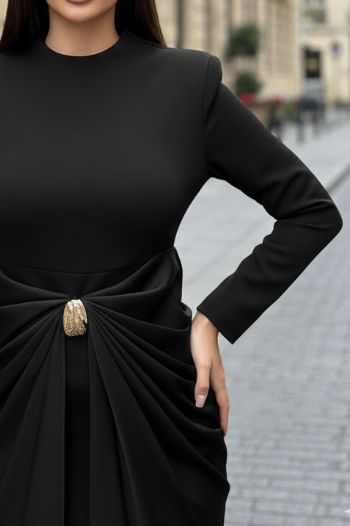 The Obsidian Luxe Draped Dress, crafted in a luxurious, smooth stretch-crepe fabric that offers a refined, body-skimming fit. The full sleeves and high neckline create a sleek silhouette, while the beautifully gathered drape at the waist—accented with an ornate gold embellishment—adds structure, glamour, and movement.