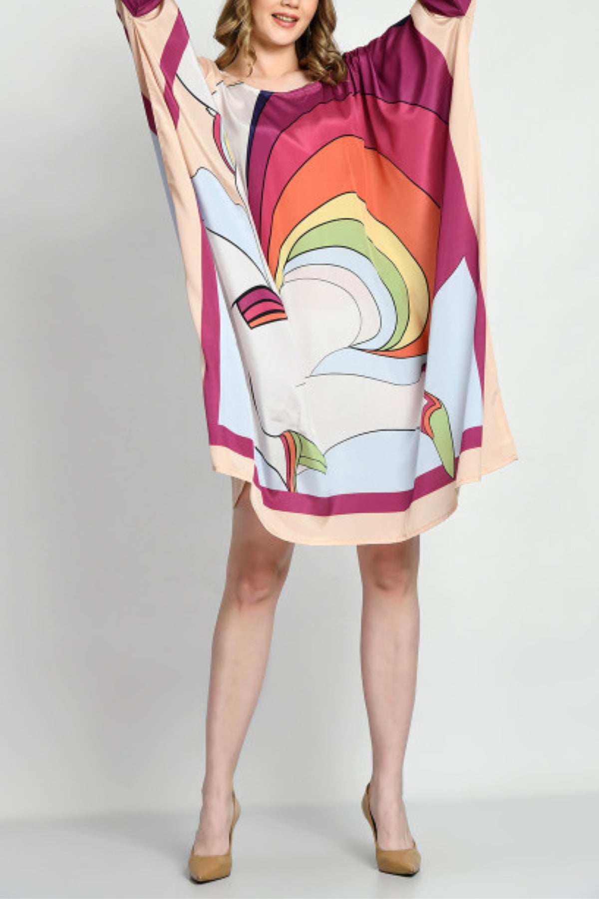 The "Rainbow Kaftan Dress" radiates vibrant energy with its playful spectrum of colors, creating a lively and comfortable fashion statement for a breezy and carefree look. Embrace a touch of joyous style with this lively kaftan dress.