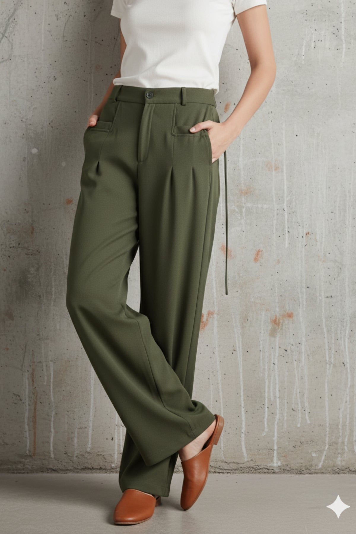 Elevate your style with these Korean wide-leg pants, featuring a semi-elasticated waist for comfort, stylish front pockets with attached strings, back welt pockets, and a secure button-up and zipper closure. The relaxed fit combines chic sophistication with everyday ease.