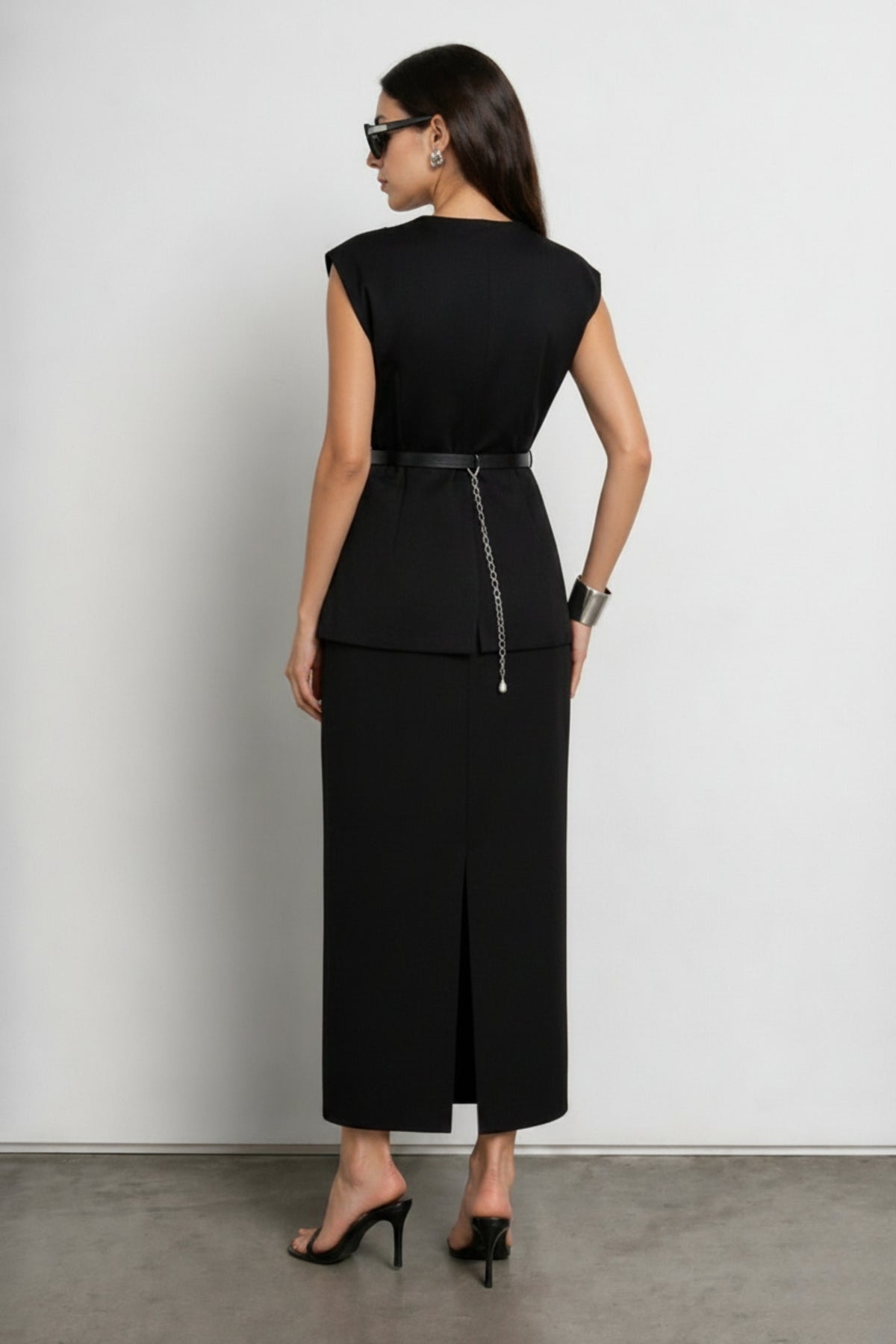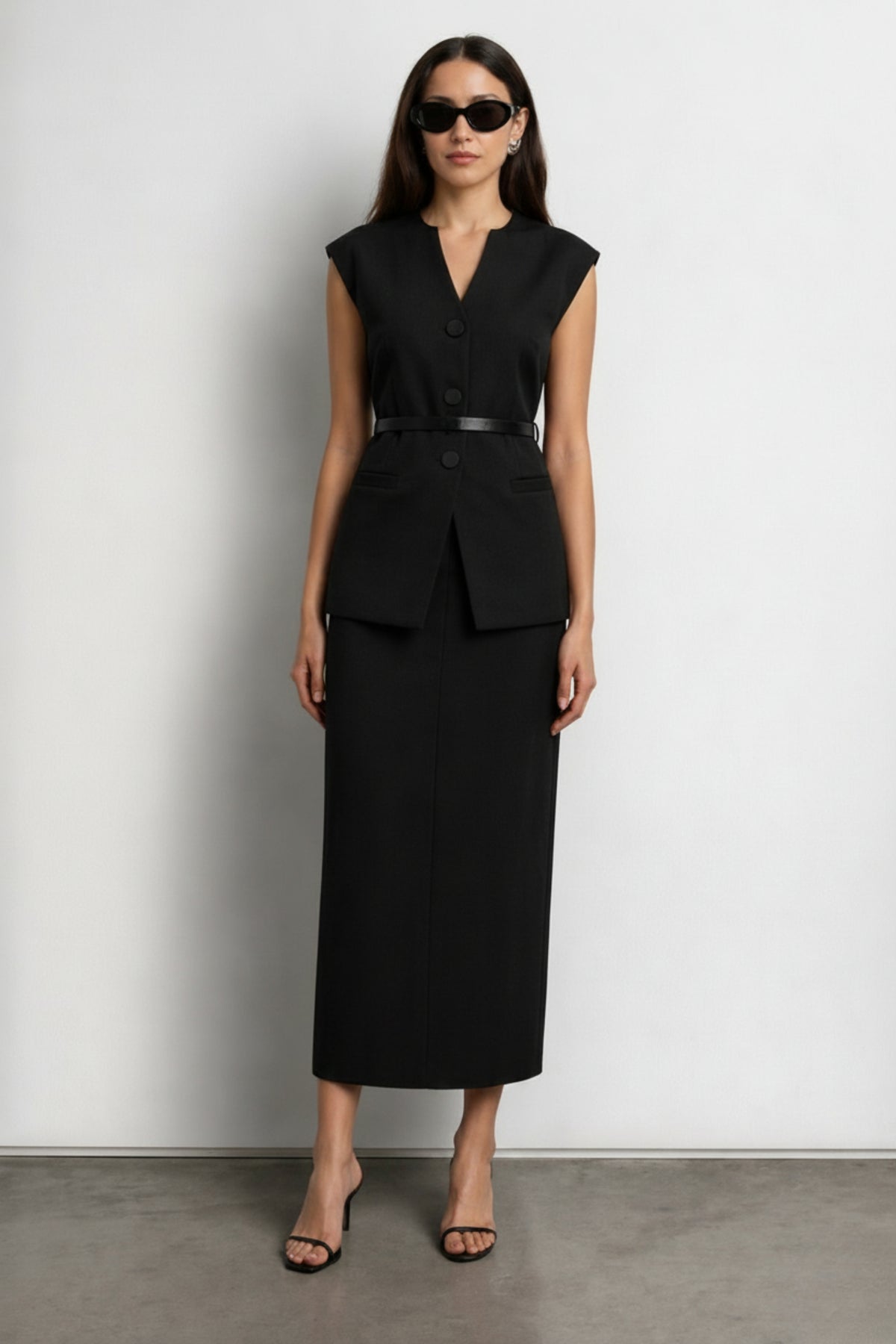 This Black Magic Waistcoat Skirt Co-ord Set features a Black Waistcoat expertly stitched in suiting fabric, with button-down closure, front pockets, along with belt loops. It is paired with a long tailored skirt with an elasticated waistband, front pockets and a back slit for easy movement. The set is accompanied by a sleek belt with silver accents.