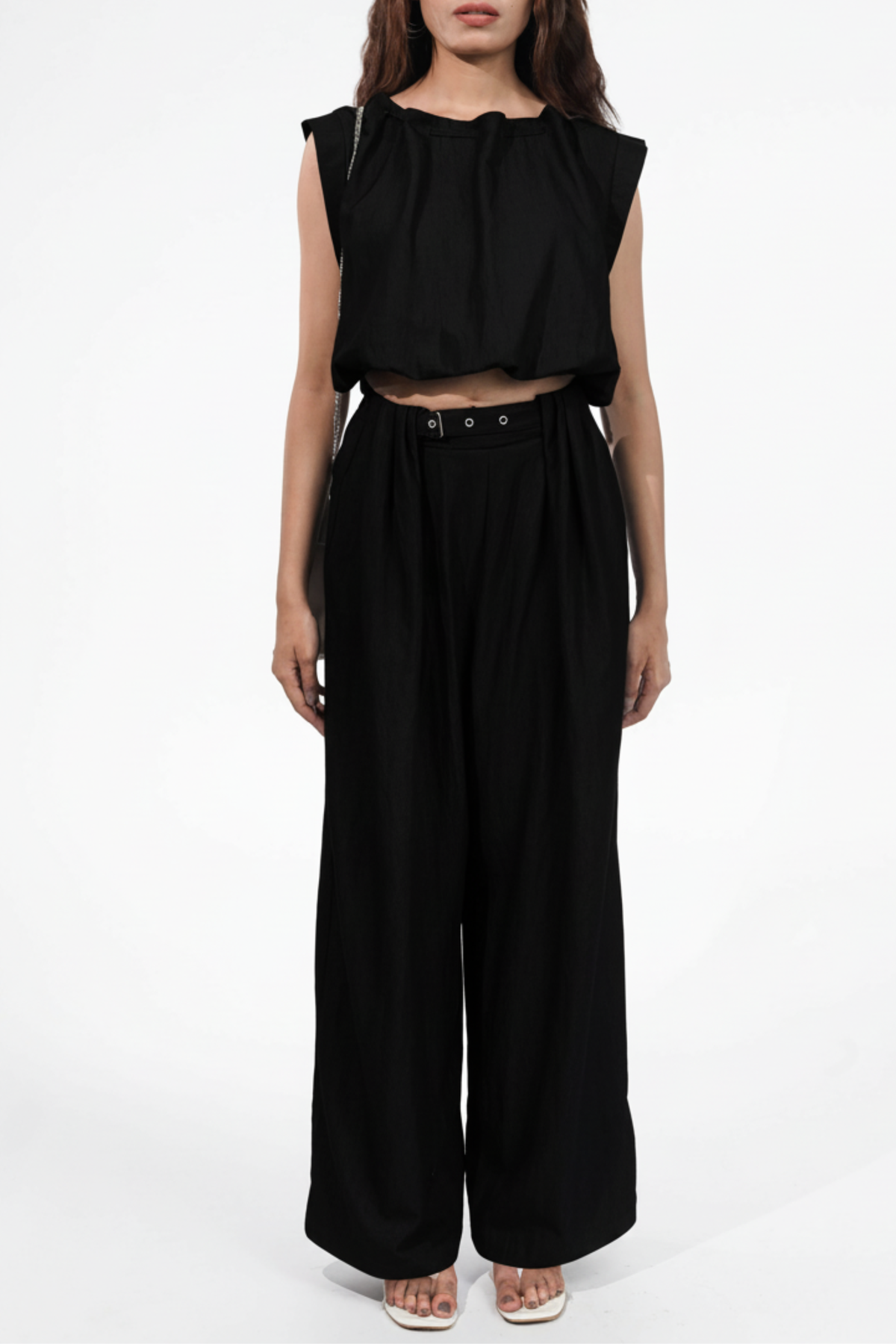 This Poof Black Linen Top & Pant Co-ord Set features a puffy top with a drawstring neckline and an elasticated waist. It is paired with flared pants with a belt design & pleats in the front along with elasticated waistband at the back and side pockets for utility.
