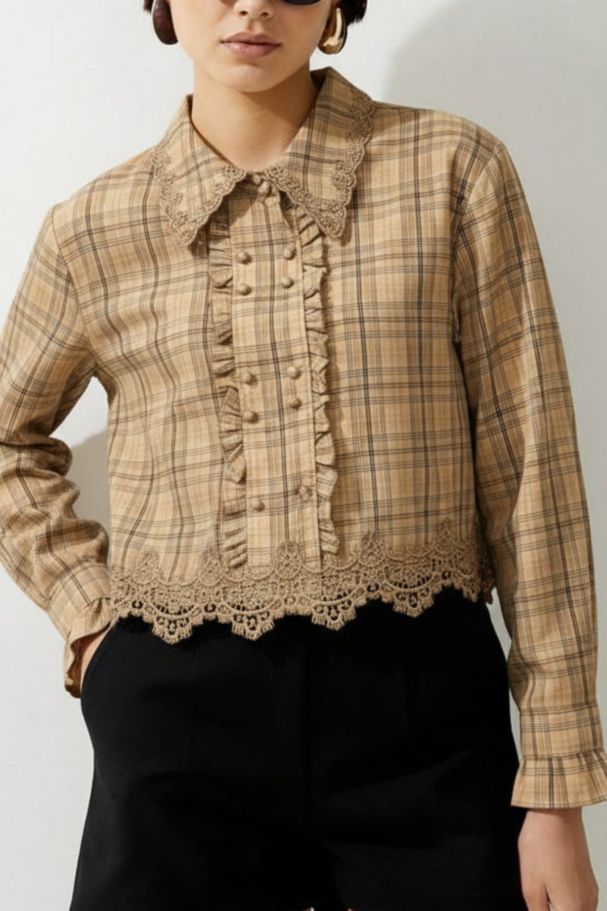 Caramel Plaid Lace Hem Ruffle Shirt Designed with soft plaid checks, delicate lace detailing, and romantic ruffle accents, it blends classic tailoring with feminine elegance. The cropped silhouette and intricate lace hem create a statement look that’s effortlessly chic for everyday styling.