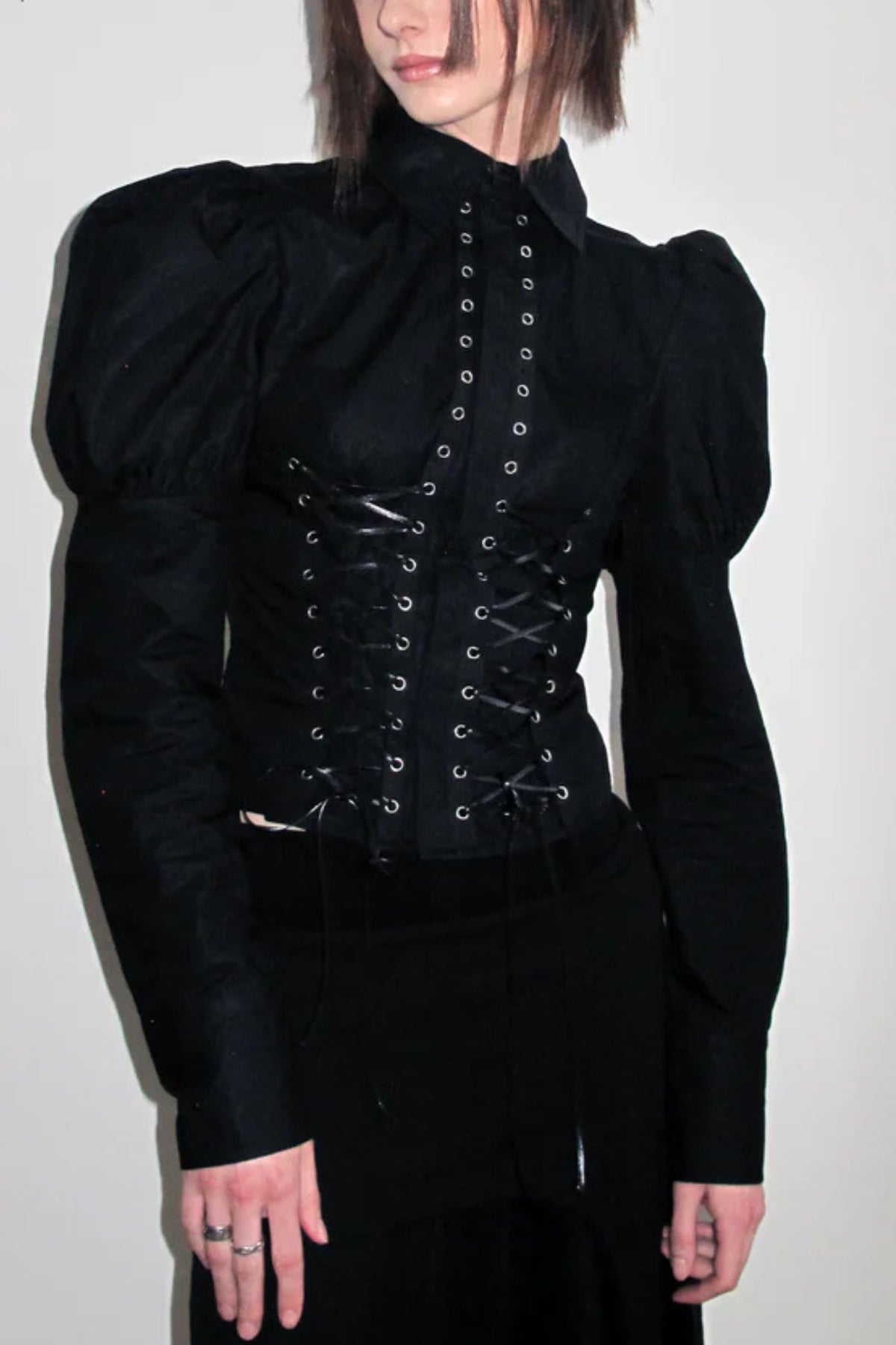 Own the night with the Grunge Black Tie-up Shirt—a bold fusion of romantic volume and edgy detailing. With corset-style lacing and puffed sleeves, this standout piece is made for those who dress to express.