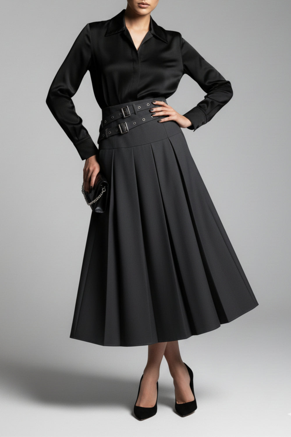 Black Dual Belt Pleat Skirt