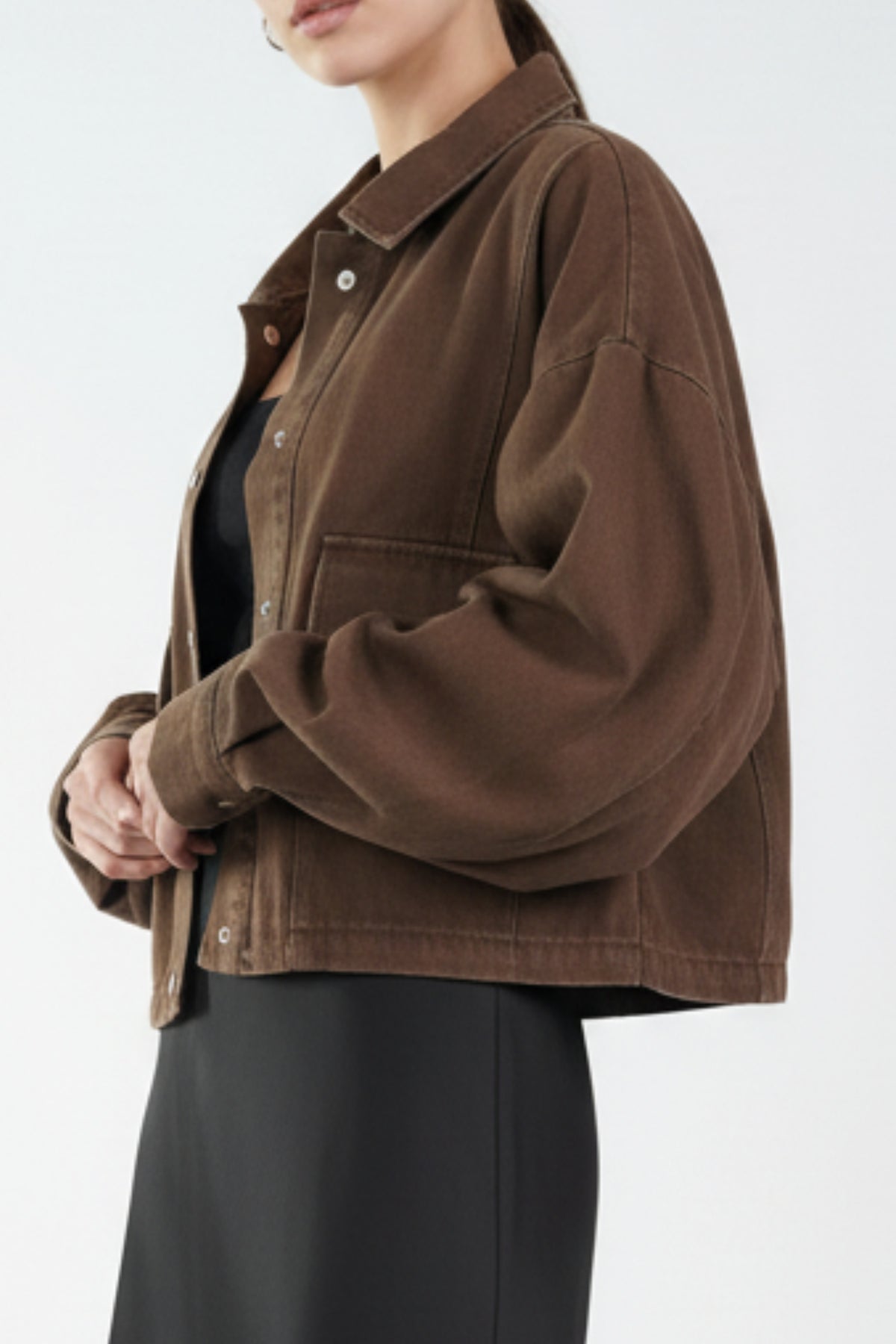 Embrace casual sophistication in our Twany Toast Oversized Jacket. Boasting a chic Brown oversized design with lining inside, it features double flap pockets and a snap button closure for a contemporary touch. The drop shoulders and full loose sleeves add a relaxed vibe, while the drawstring at the waist allows for a customizable fit. Elevate your style with this effortlessly cool and versatile piece.