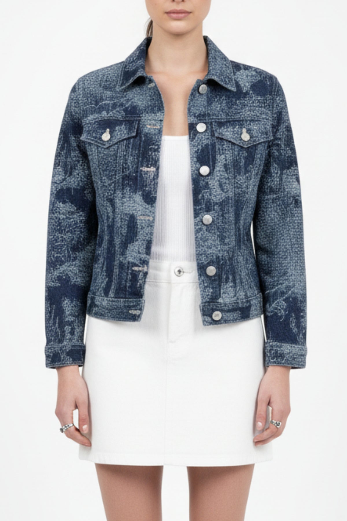 This Oversized Navy Blue Woven Denim Jacket features woven abstract patterns and pockets on both sides, with a flap on one pocket, white metal buttons along with a classic collar and white stitching details. A perfect mix of oversized comfort and creative design, this jacket makes a statement with every wear.