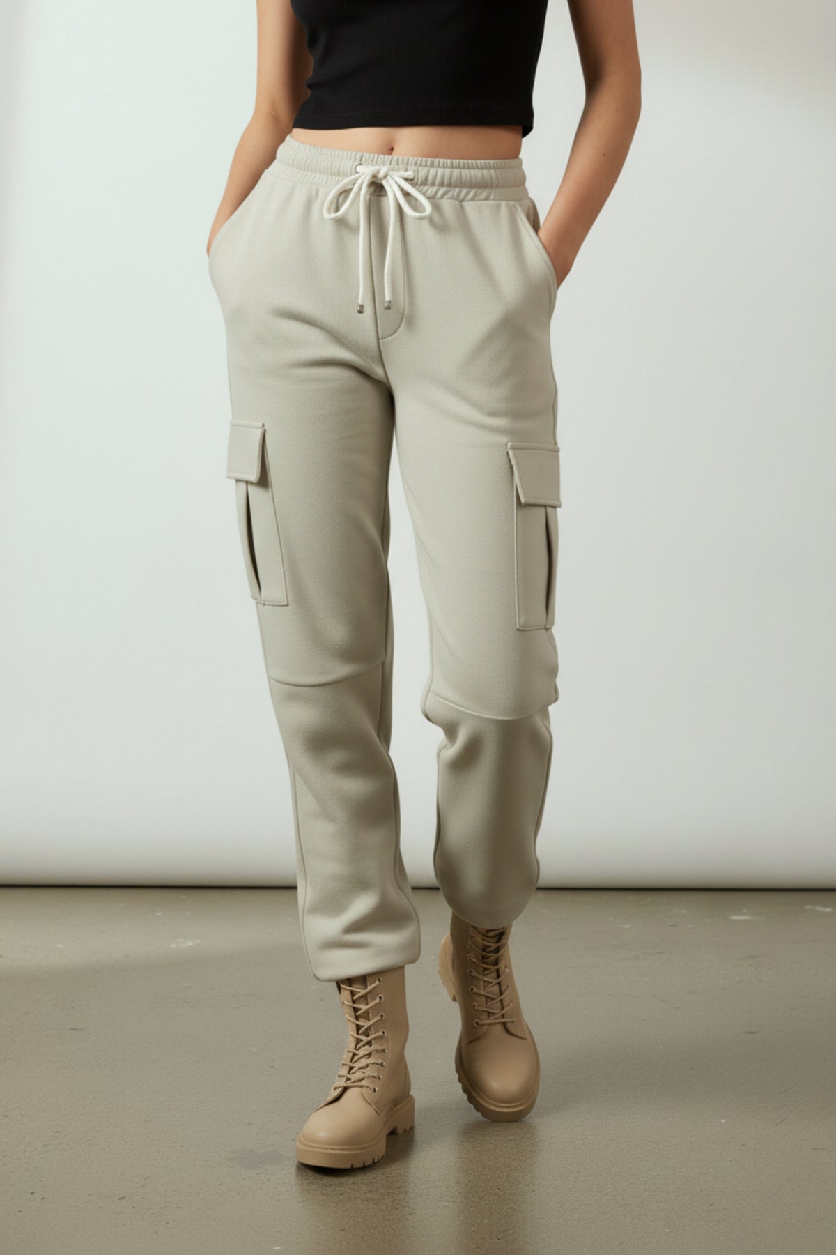 Experience comfort and style in our versatile Soft Sage Utility Cargos. The elasticated waist with a drawstring ensures a tailored fit, while side and cargo flap pockets add functionality. The drawstring at the pant opening allows for a customizable look. Elevated by knee detailing, these trousers seamlessly blend casual and chic, making them a wardrobe essential for a modern, dynamic aesthetic.