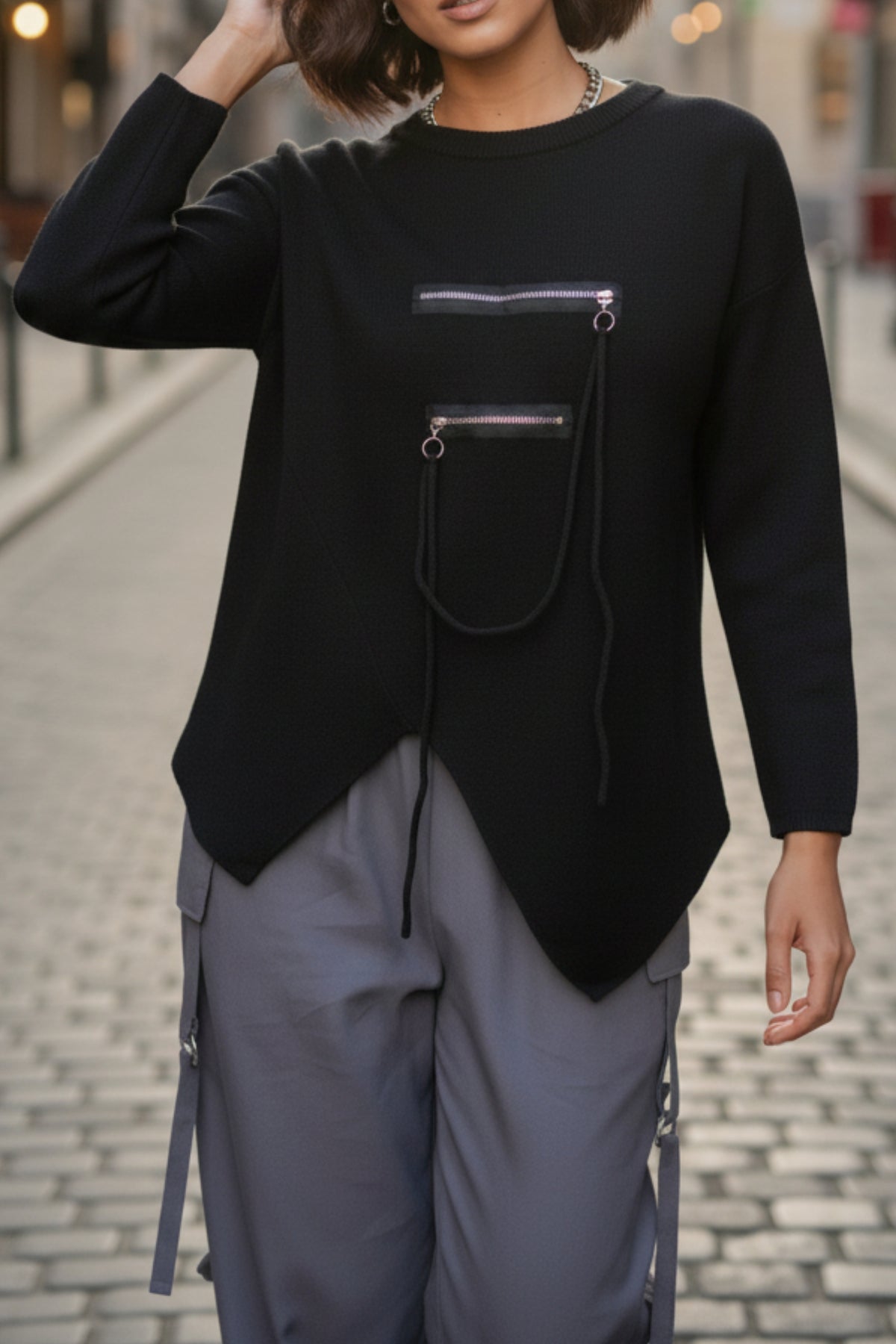 This black oversized knitted wool sweater combines ultimate comfort with chic style, featuring sleek silver zip details and a fun front drawstring. The asymmetrical hem adds a contemporary touch, creating a flattering, unique silhouette. Perfect for achieving an effortlessly cool and cozy layered look.