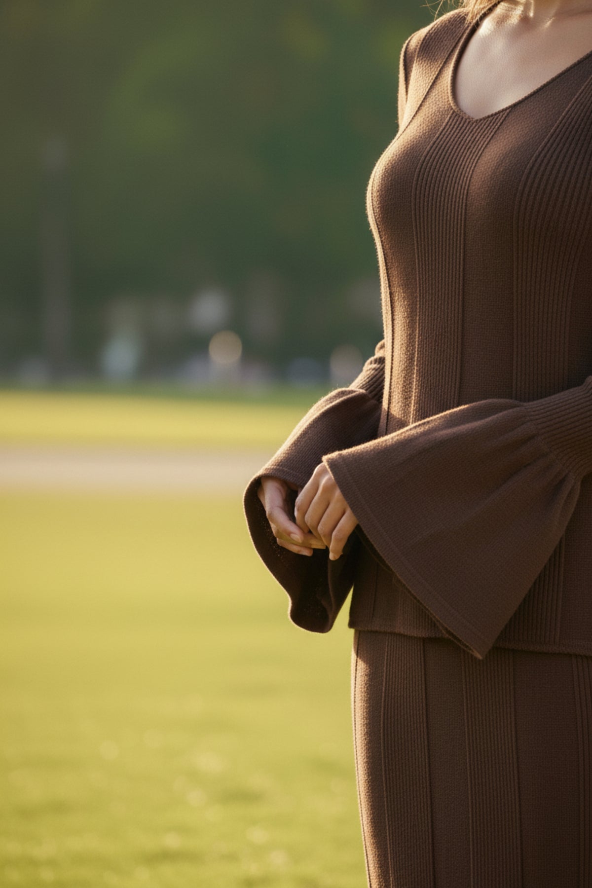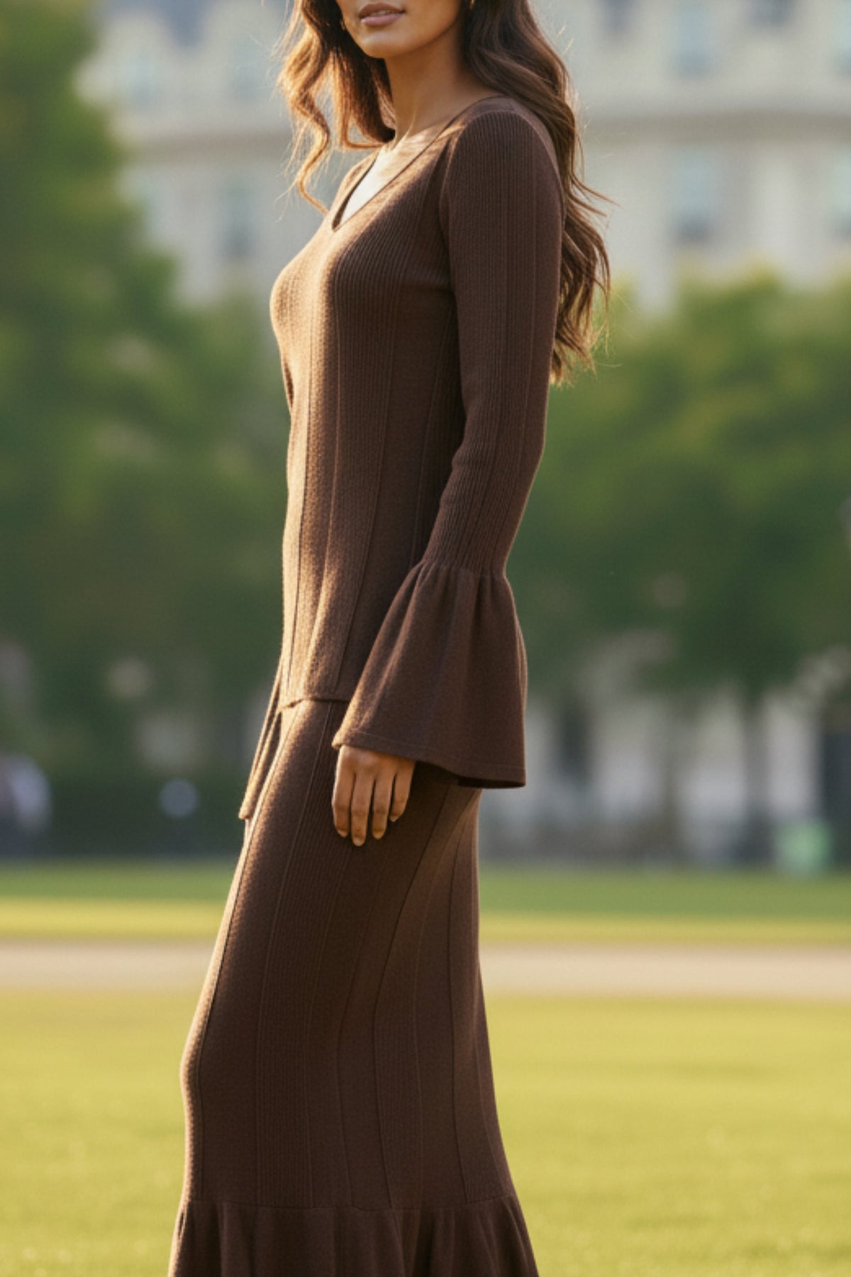 The Hazel Knit Ruffle Skirt Co-ord Set is a perfect blend of comfort and feminine sophistication. Designed in a warm hazel brown tone, this co-ord set features a soft knit top with full-length flared sleeves and a scoop neckline, paired with a matching ruffle-hem midi skirt..