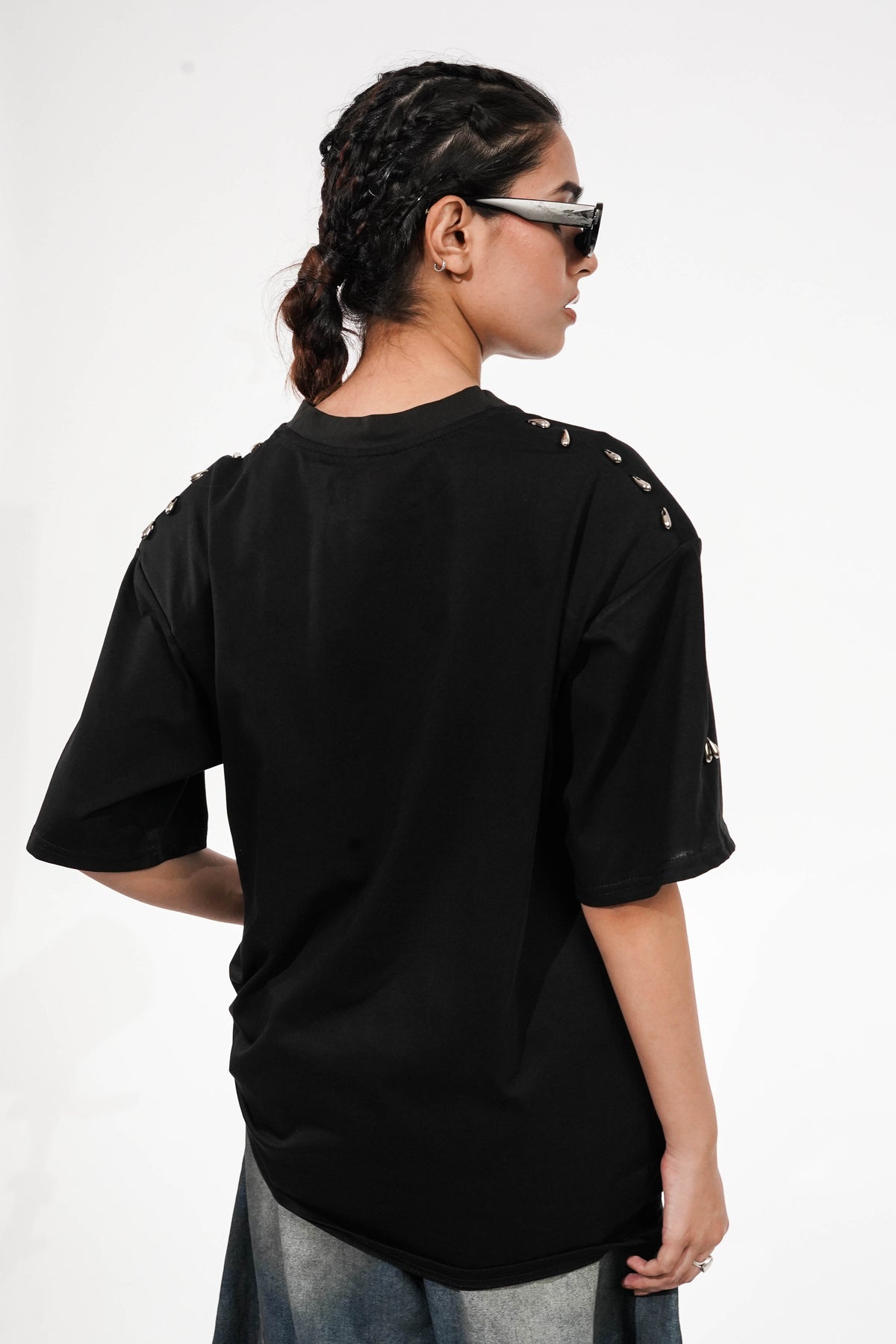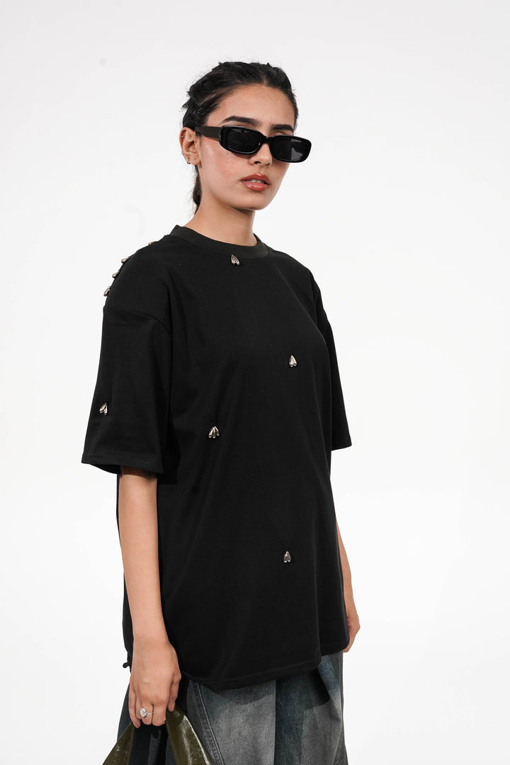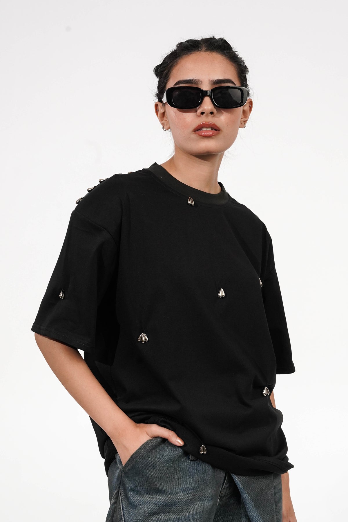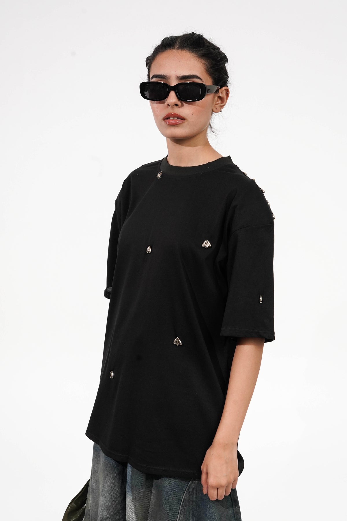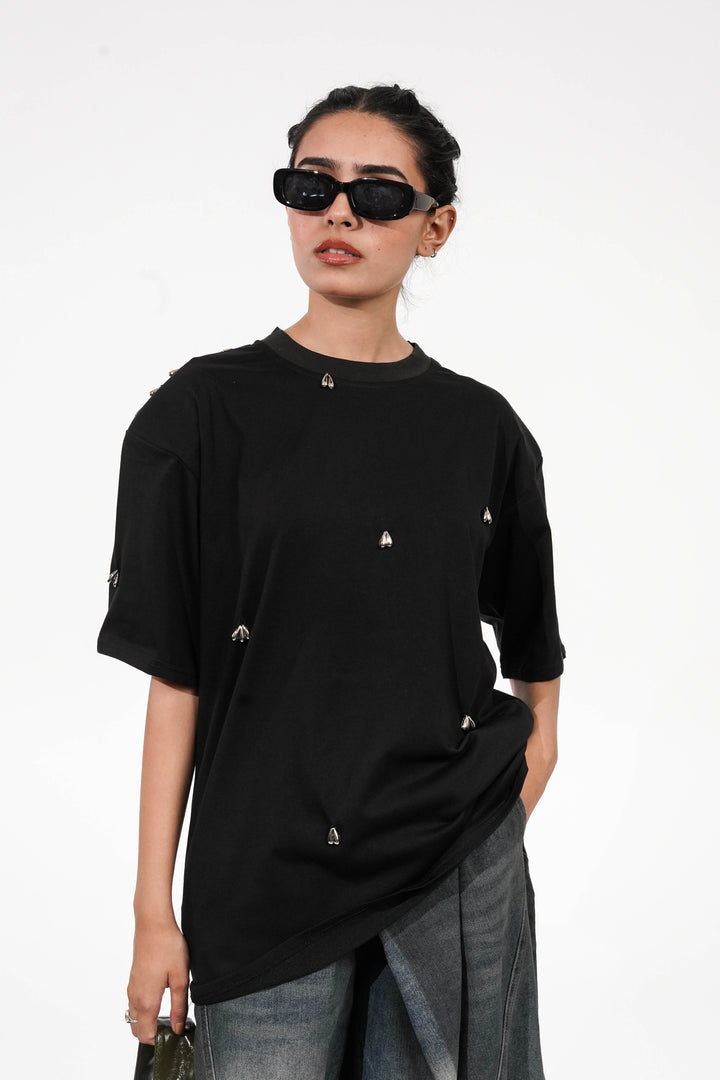 Elevate your off-duty wardrobe with the Regina Black Charm T-Shirt, a unique fusion of comfort and subtle edge. Cut from a premium cotton-blend fabric, this oversized silhouette is dotted with miniature metallic charm accents placed artfully across the front and sleeves—adding a statement touch without being loud. The relaxed drop-shoulder design makes it an effortless pick for styling up or down.