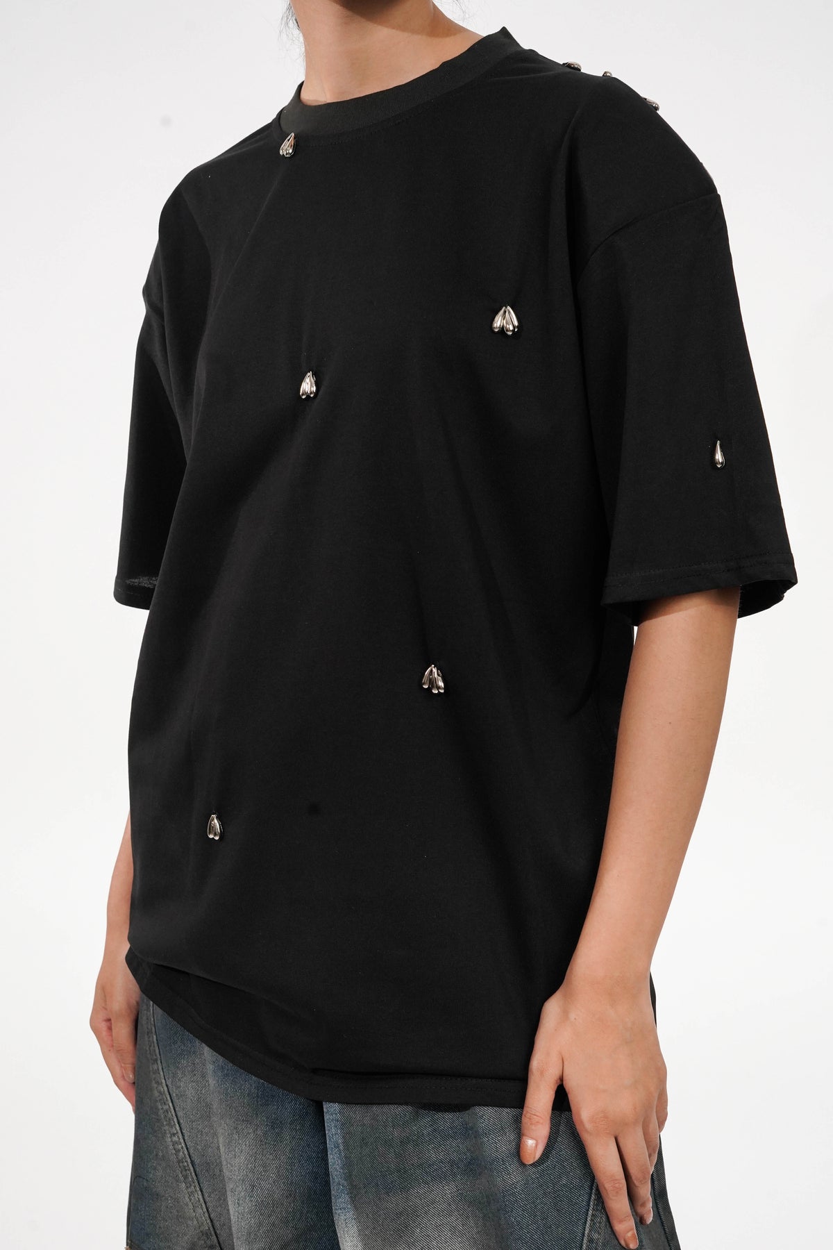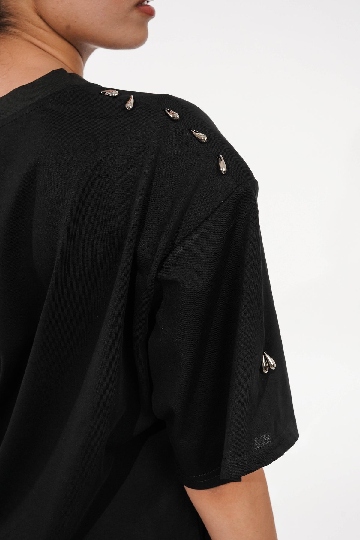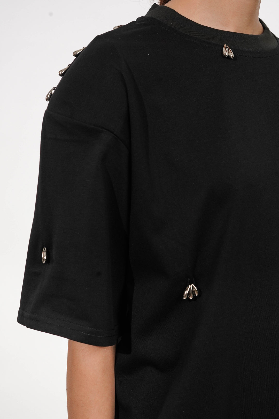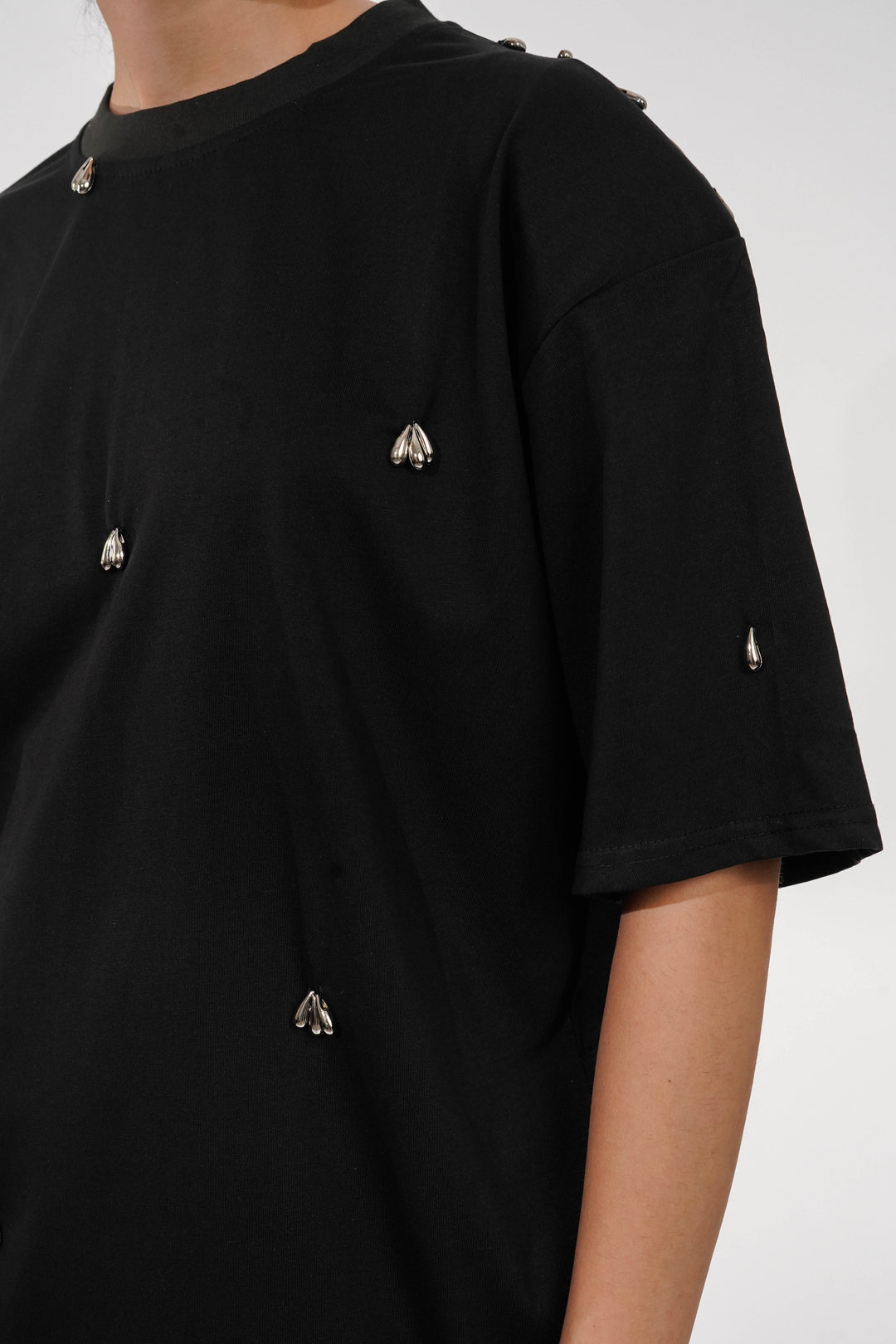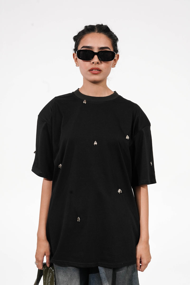 Elevate your off-duty wardrobe with the Regina Black Charm T-Shirt, a unique fusion of comfort and subtle edge. Cut from a premium cotton-blend fabric, this oversized silhouette is dotted with miniature metallic charm accents placed artfully across the front and sleeves—adding a statement touch without being loud. The relaxed drop-shoulder design makes it an effortless pick for styling up or down.