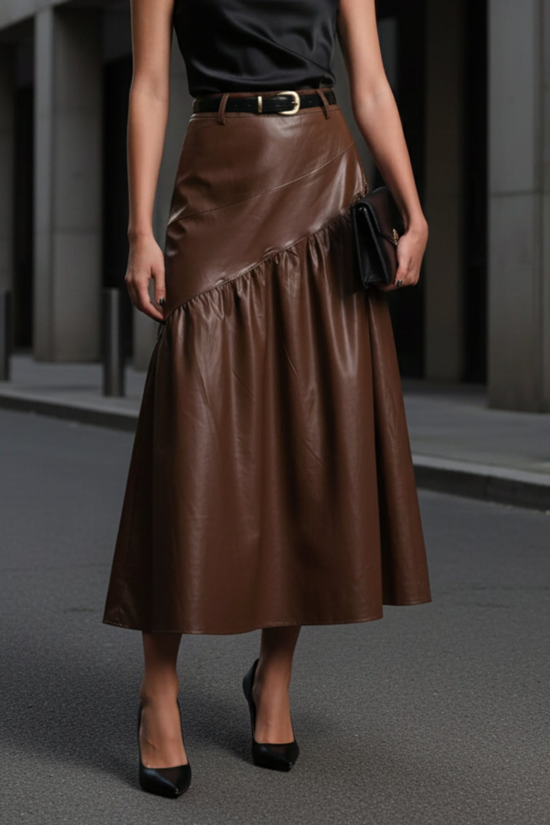 Espresso Belted Faux Leather Skirt