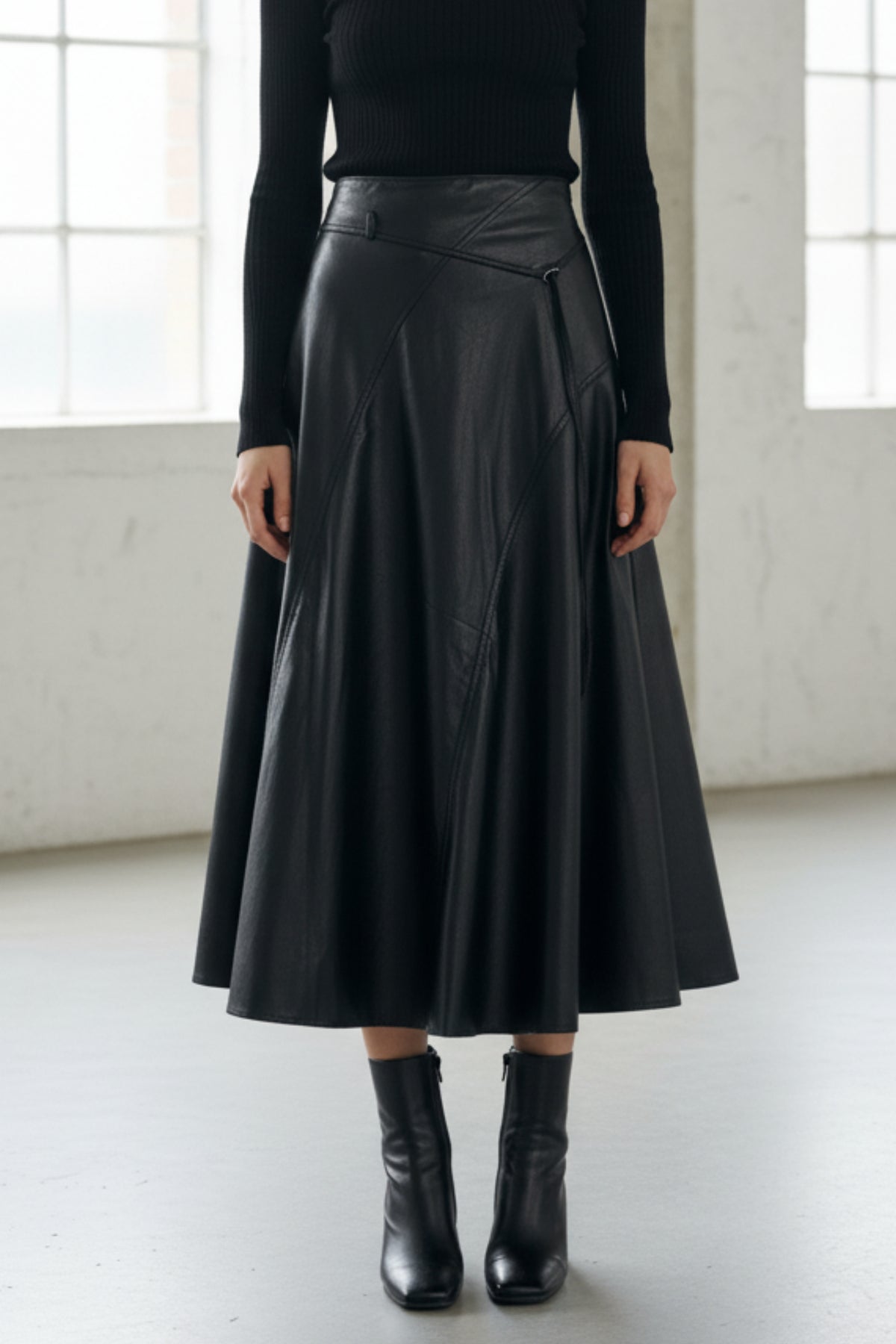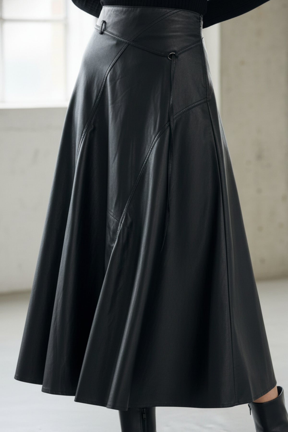 - Detail : Asymmetric panel stitching, soft sheen finish, flared silhouette, wrap-inspired contour lines