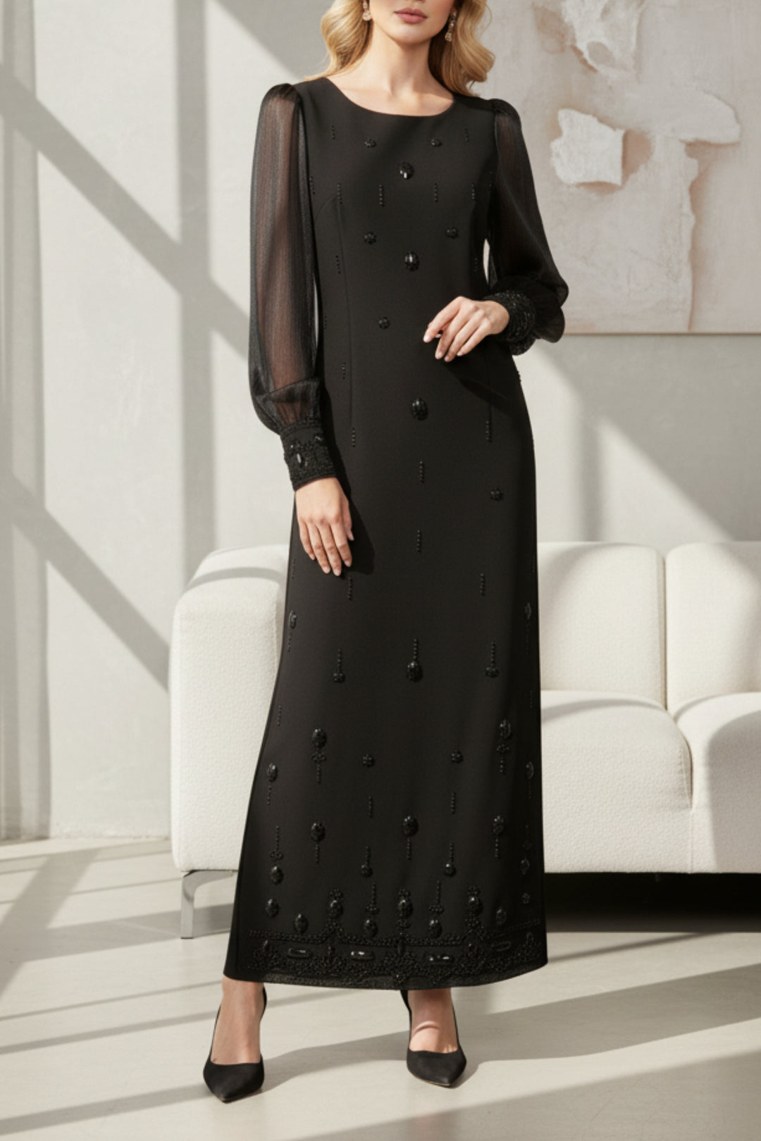 Our long-sleeve maxi dress captures the perfect balance between modesty and elegance. Designed for flowy sleeves and a flattering fit, it sits perfectly for cooler days or formal events and can be the perfect winter maxi dresses. This is one of those versatile pieces that can be dressed up or down for different events.