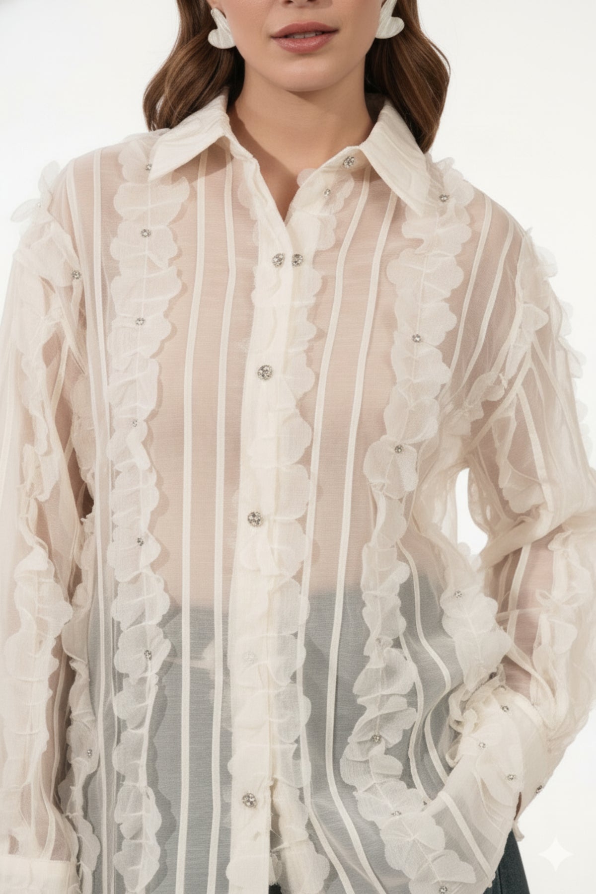 - Details: Cream sheer shirt with vertical floral applique panels and crystal-style buttons