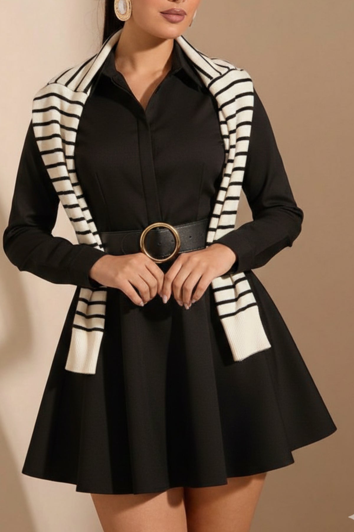 Black Belted White Overlay Shirt Dress Designed with a classic shirt collar and voluminous long sleeves, this piece blends structured tailoring with soft feminine movement. The contrast white knit overlay draped across the shoulders adds a preppy, layered effect, while the flared mini skirt creates a flattering, playful silhouette. Finished with a statement belt that cinches the waist, this dress is perfect for creating a polished yet fashion-forward look.