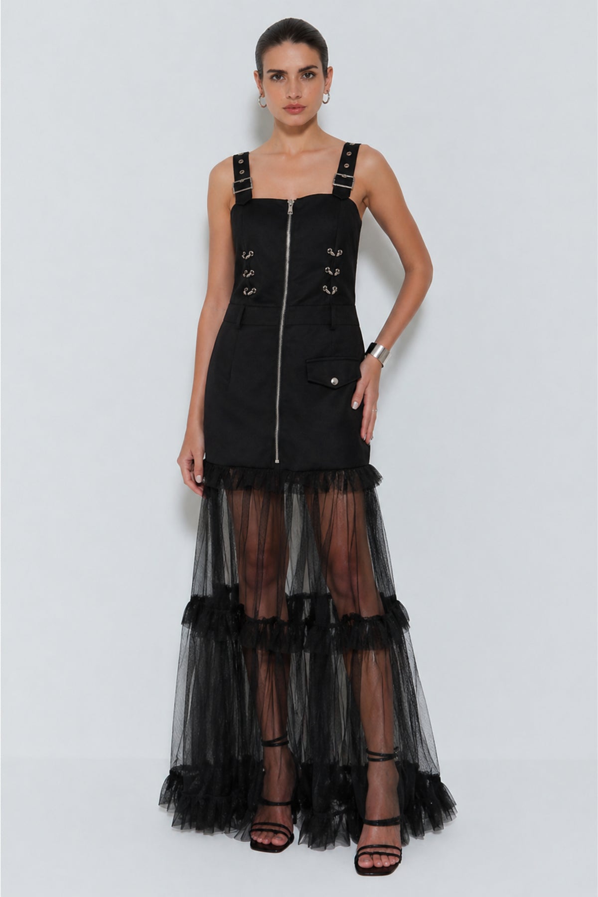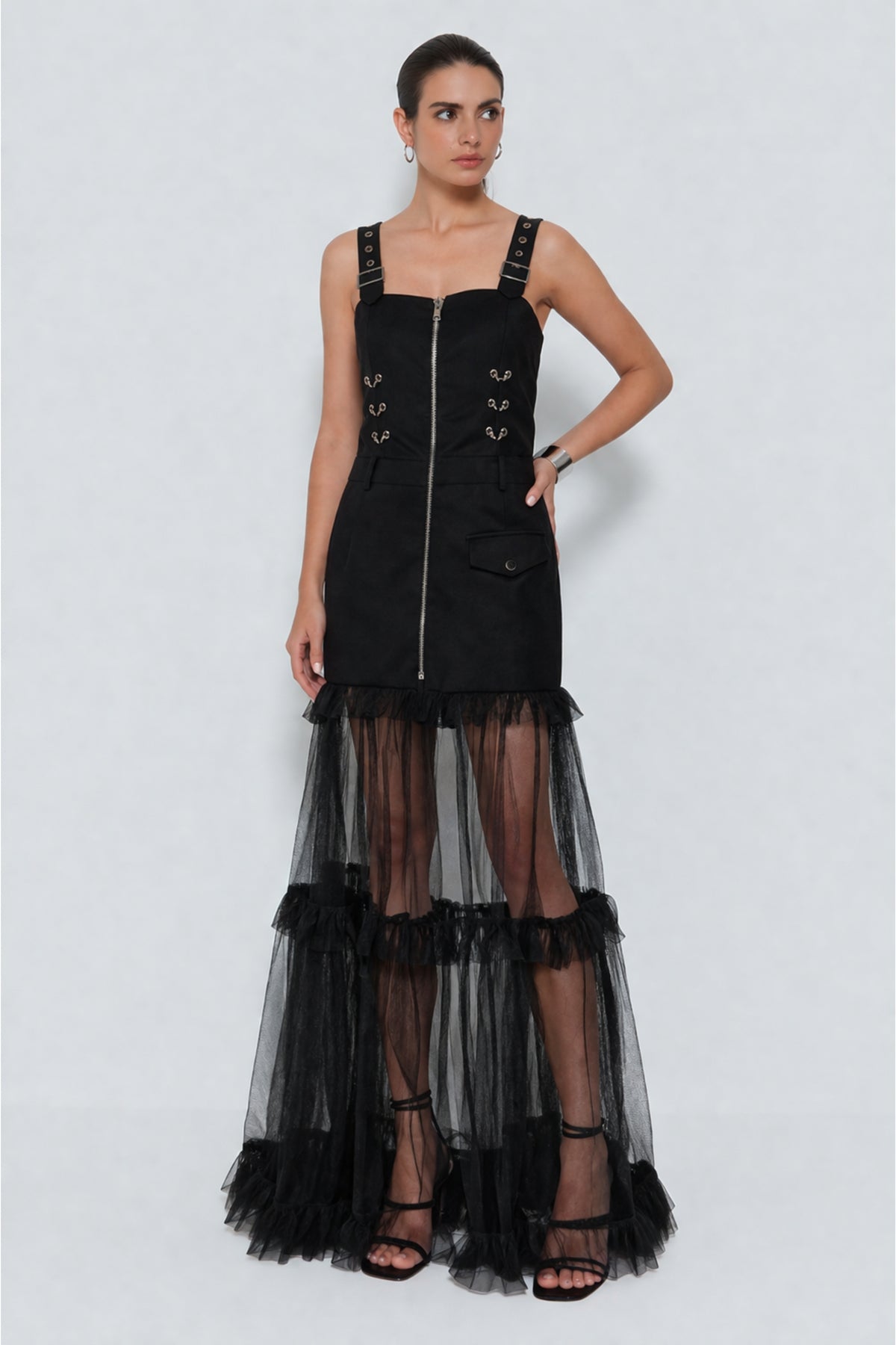 - Details: Front zipper, tiered ruffle mesh layers, decorative hook loops, flap pocket accents