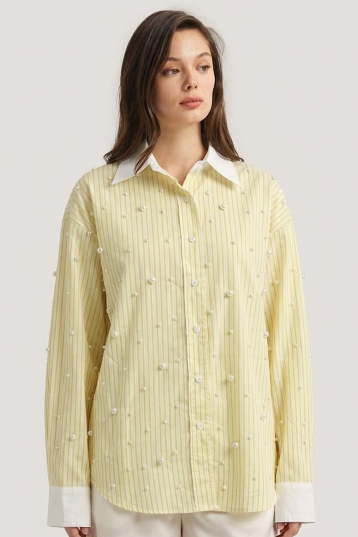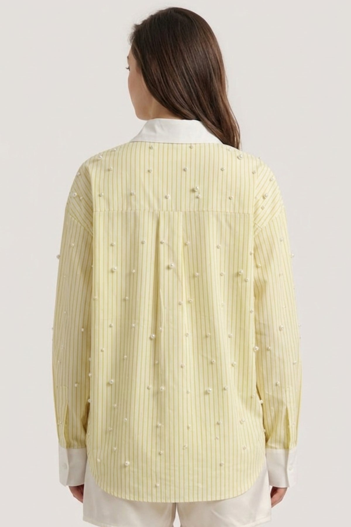 Brighten up your wardrobe with the Butter Yellow Pearl Striped Shirt, a fresh take on classic stripes with a hint of elegance. Designed with soft vertical stripes and delicate pearl embellishments, this shirt blends sophistication with everyday ease. The crisp white collar and cuffs add contrast, making it a refined yet playful statement piece.