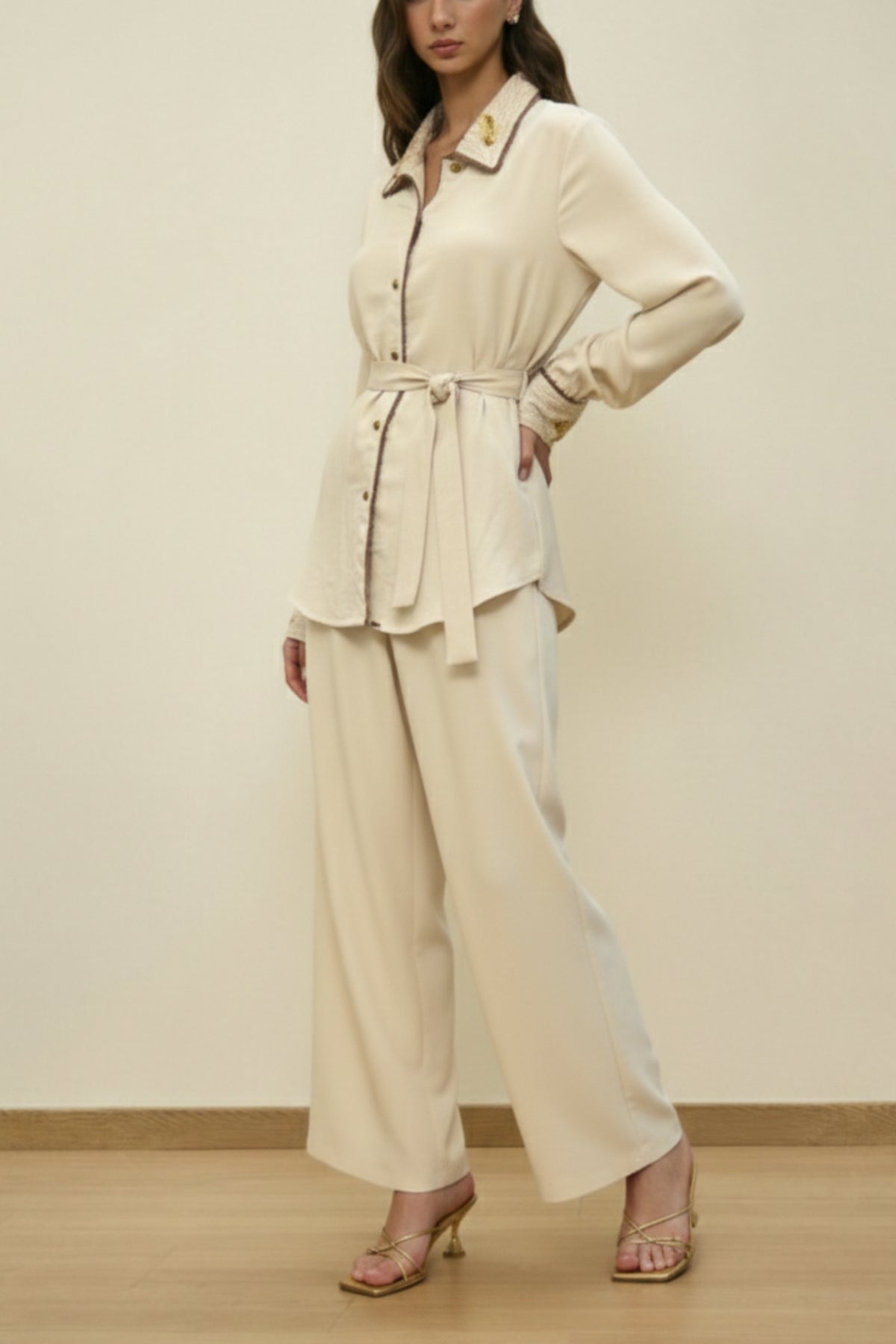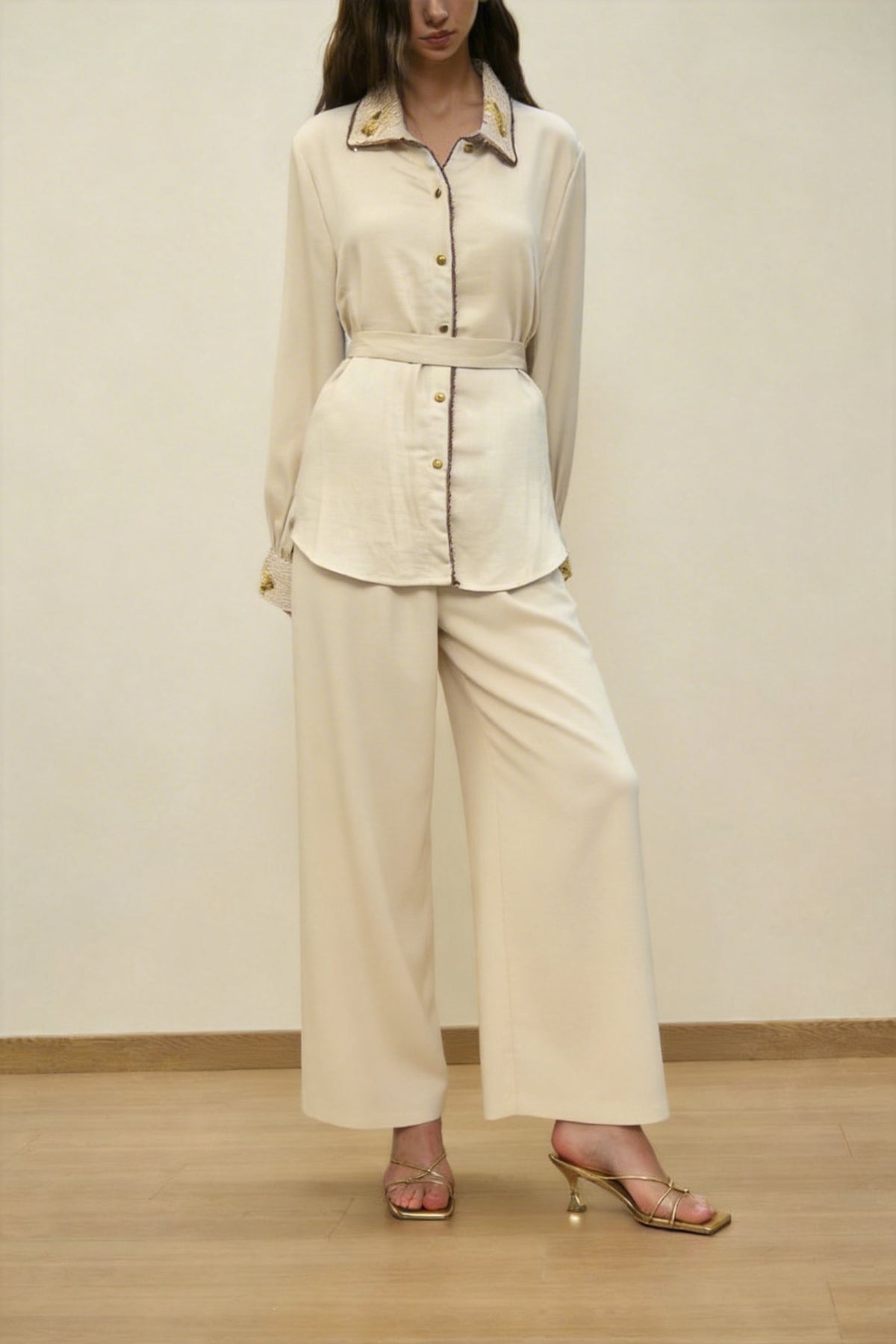 Elevate your wardrobe with this elegant ivory co-ord set designed for effortless sophistication. Featuring a delicately embellished collar and statement cuffs, this set blends subtle glamour with timeless tailoring. The belted waist enhances your silhouette, while the relaxed-fit pants ensure all-day comfort with polished appeal.