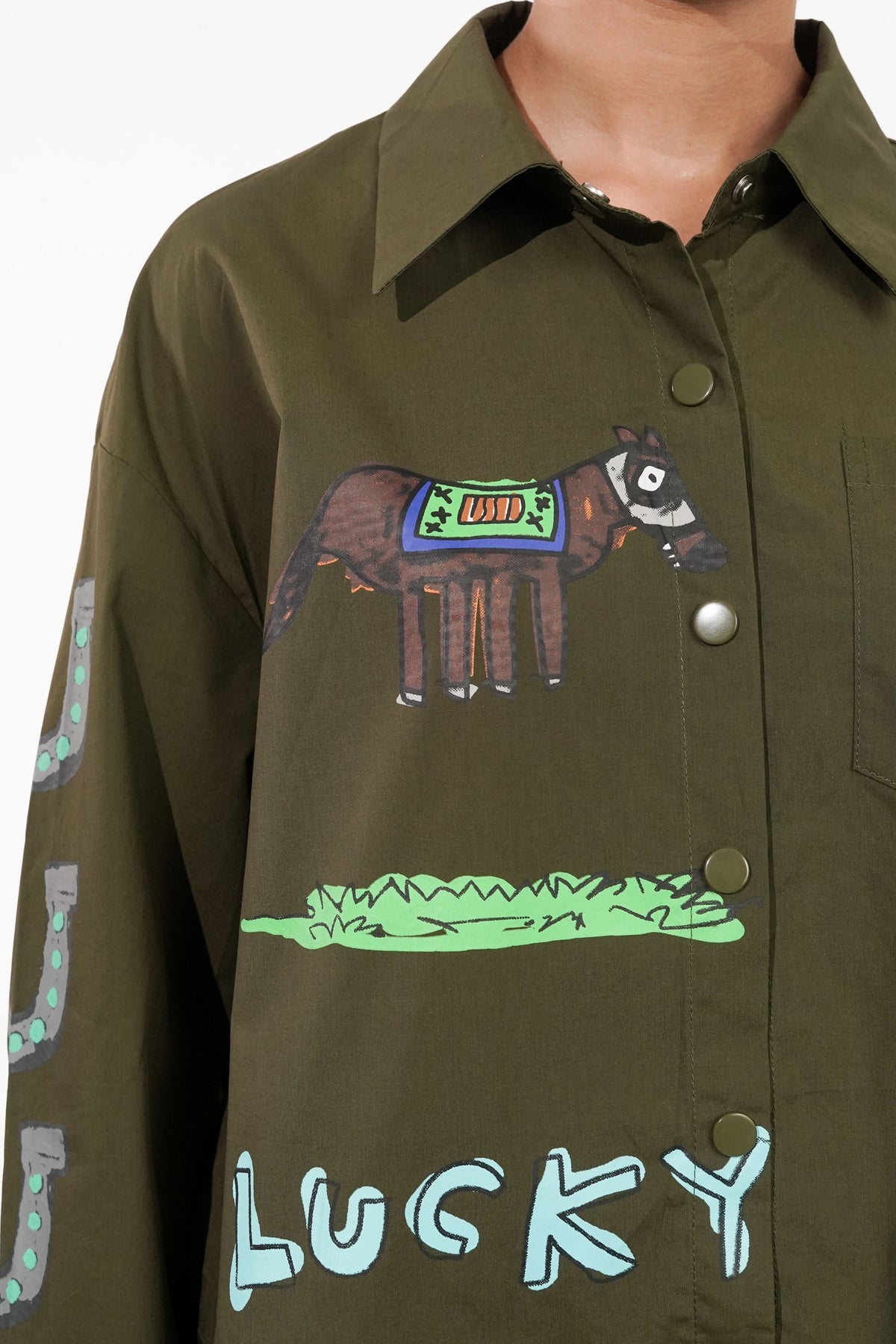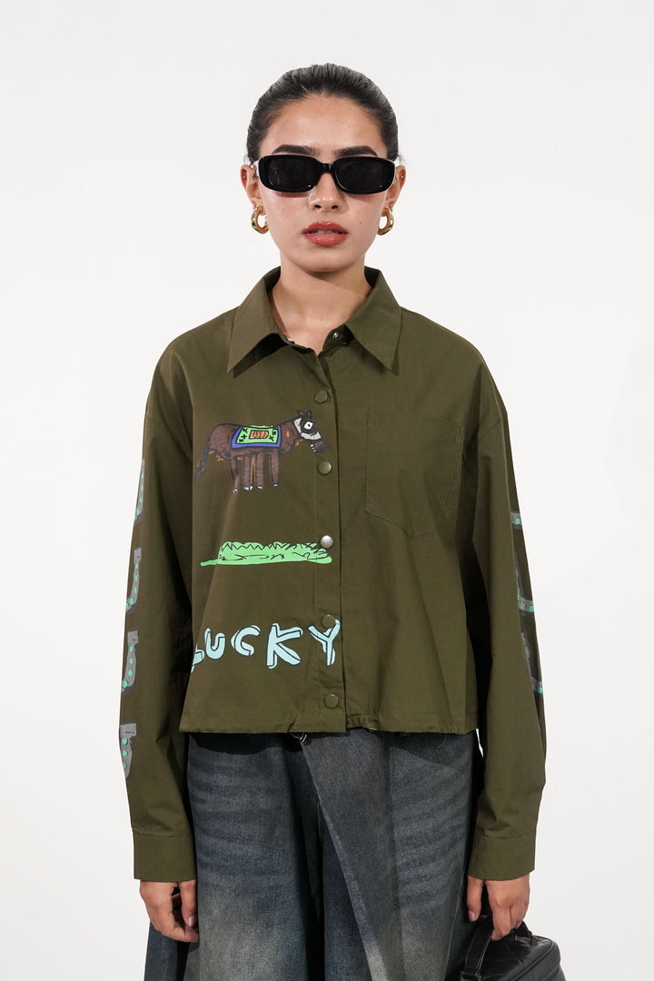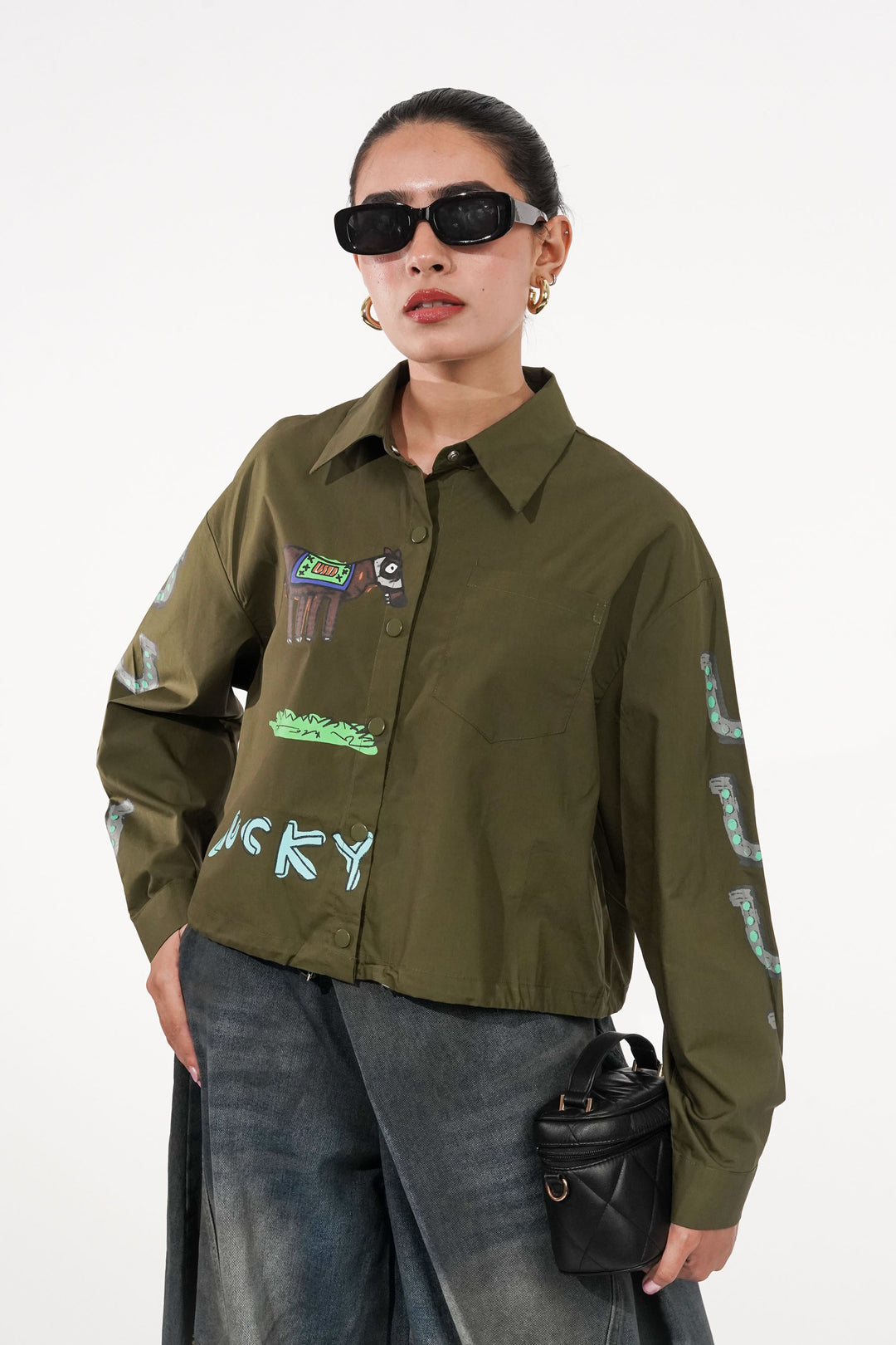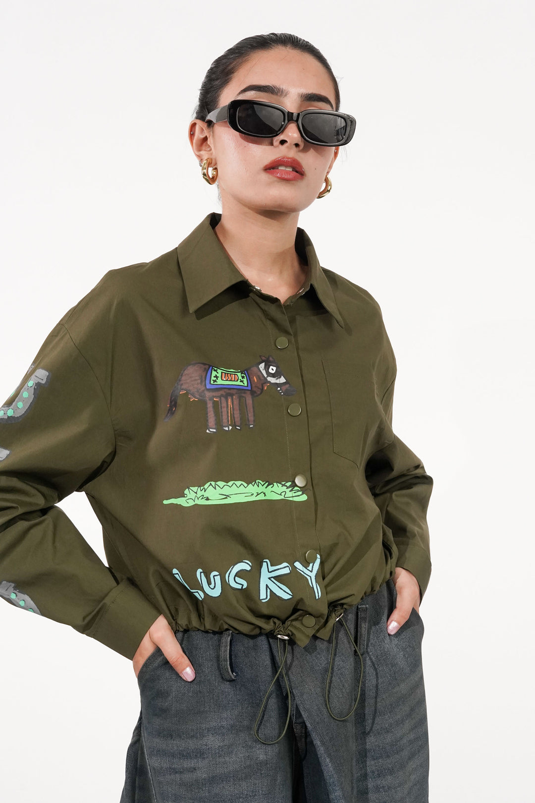 Stand out in style with our Martini Olive Printed Shirt – a quirky piece that blends art with fashion. Crafted from lightweight cotton fabric, this shirt features hand-drawn style prints and playful animal illustrations in a cropped silhouette with a front patch pocket, a classic collar and a drawstring at the waist makes it perfect if you want to cinch your waist.