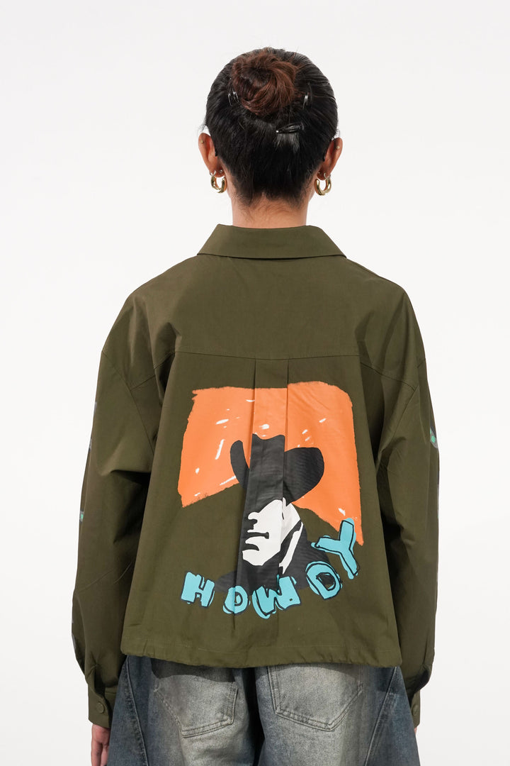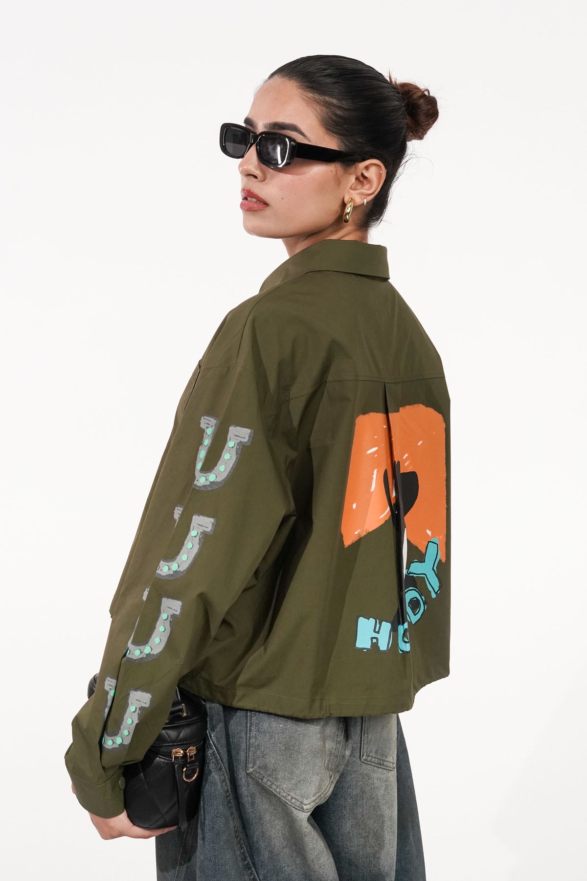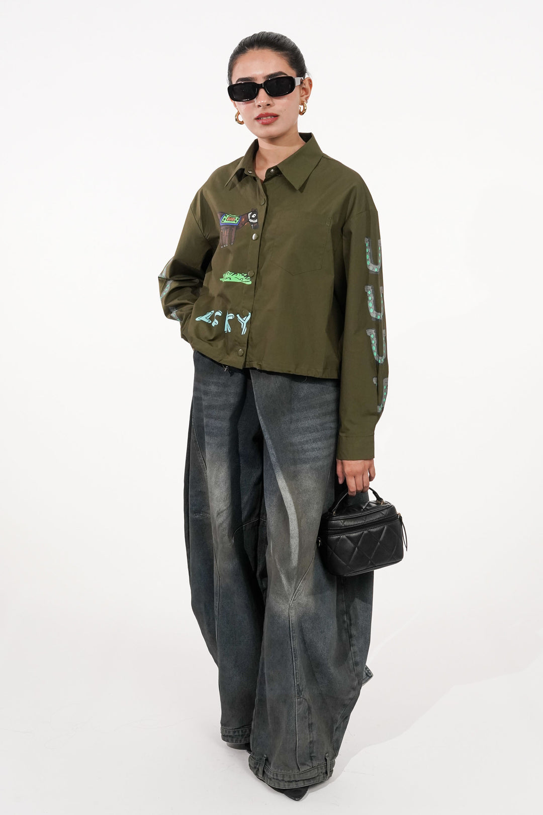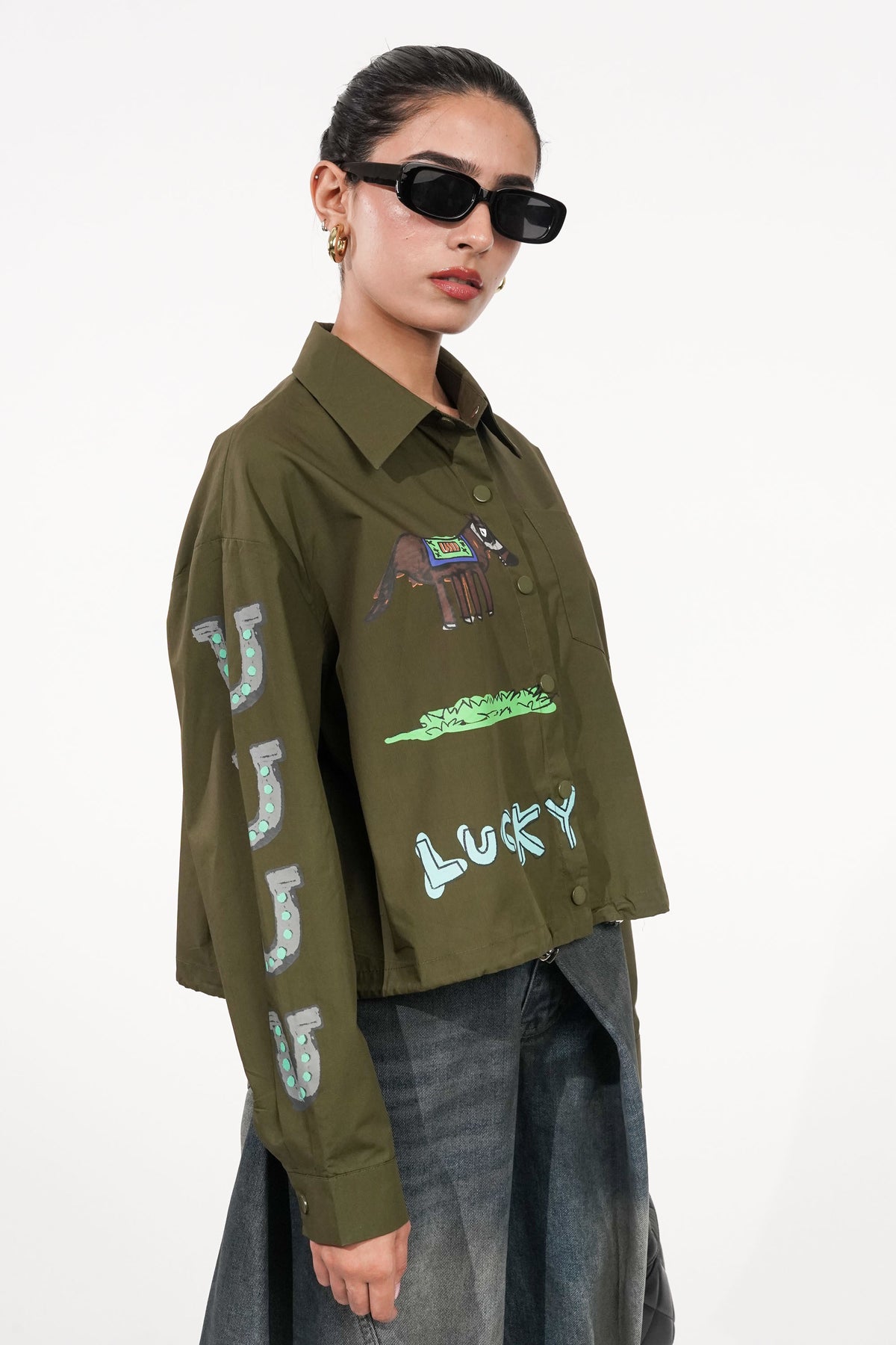 Stand out in style with our Martini Olive Printed Shirt – a quirky piece that blends art with fashion. Crafted from lightweight cotton fabric, this shirt features hand-drawn style prints and playful animal illustrations in a cropped silhouette with a front patch pocket, a classic collar and a drawstring at the waist makes it perfect if you want to cinch your waist.