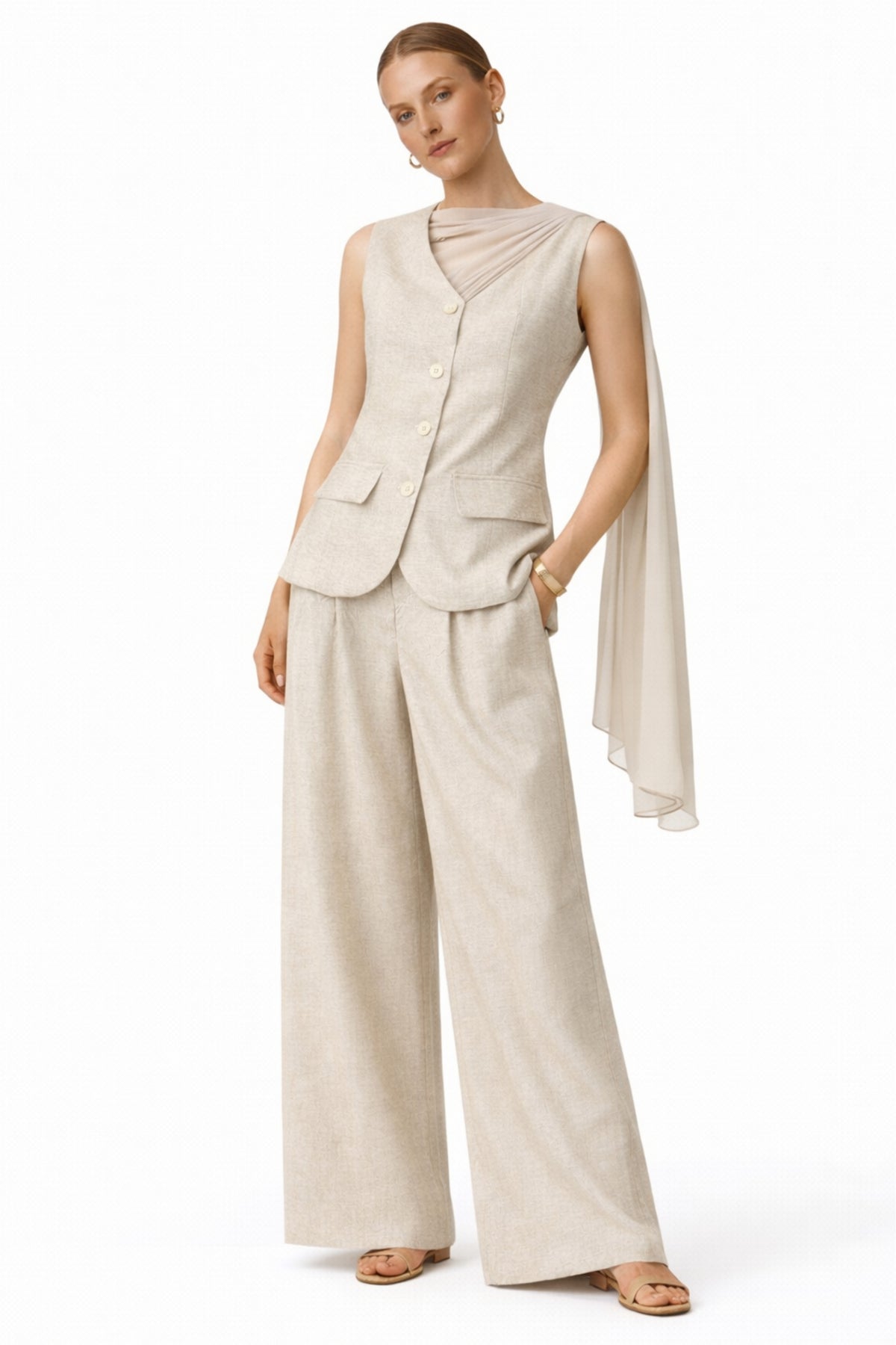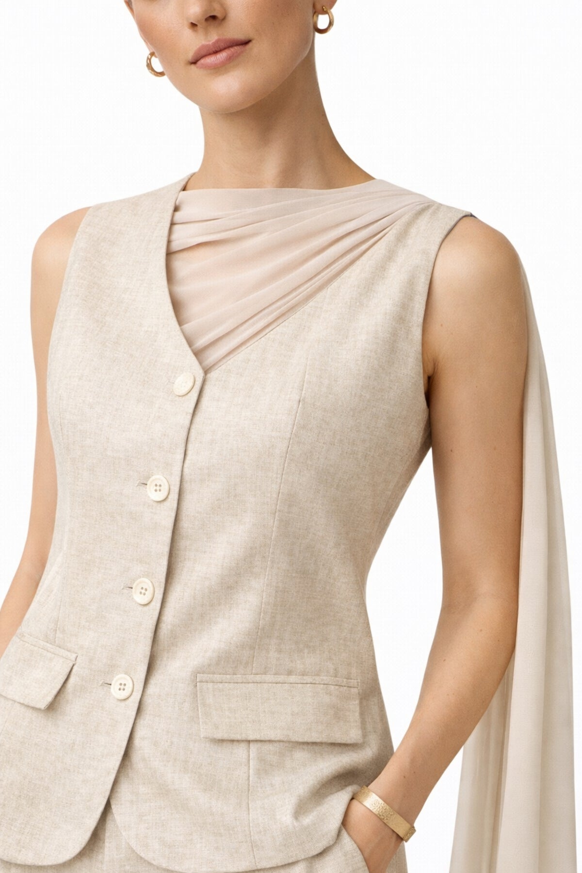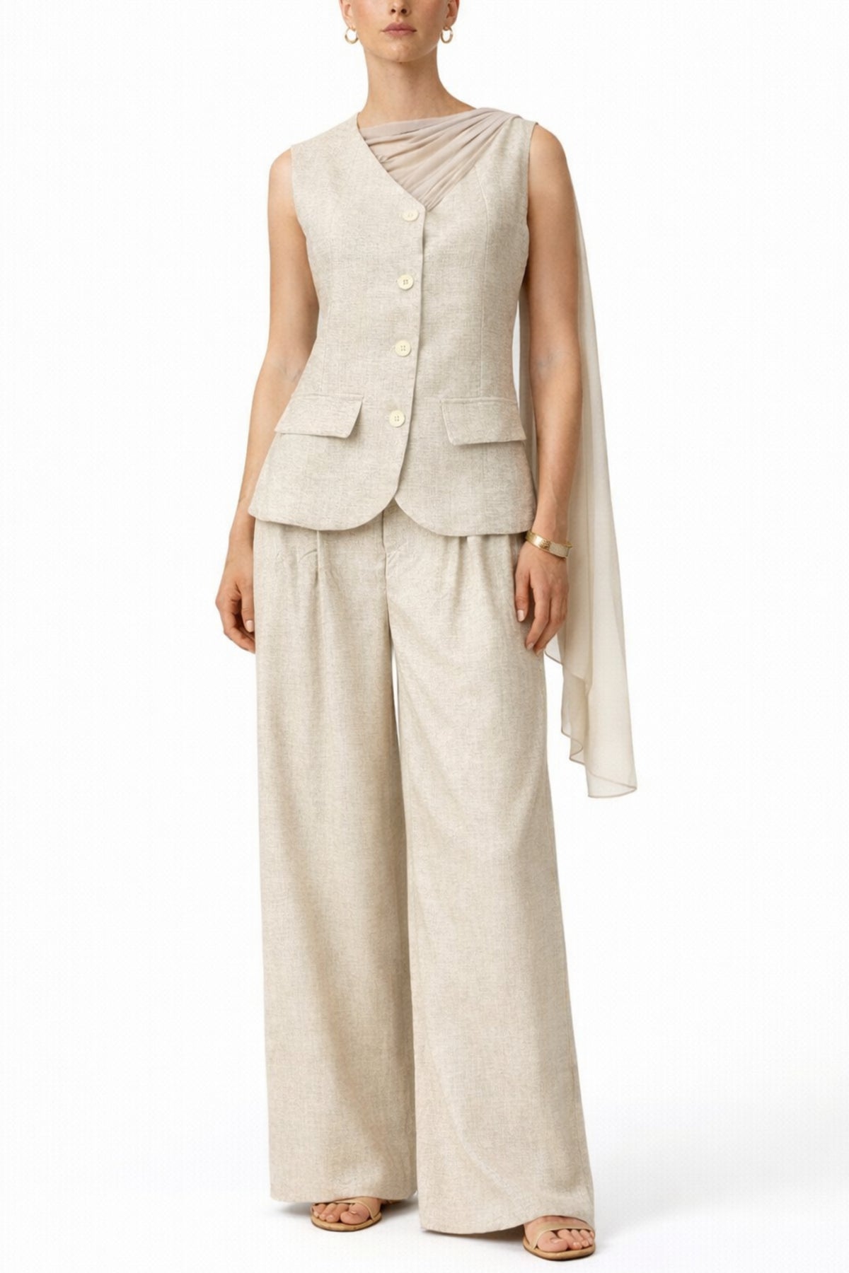 The Sahara Veil Co-Ord is the perfect blend of tailored structure and soft elegance. Designed in a textured beige fabric, the sleeveless button-down vest features a flattering V-neckline, flap pockets and a draped chiffon veil detail that falls effortlessly over one shoulder.