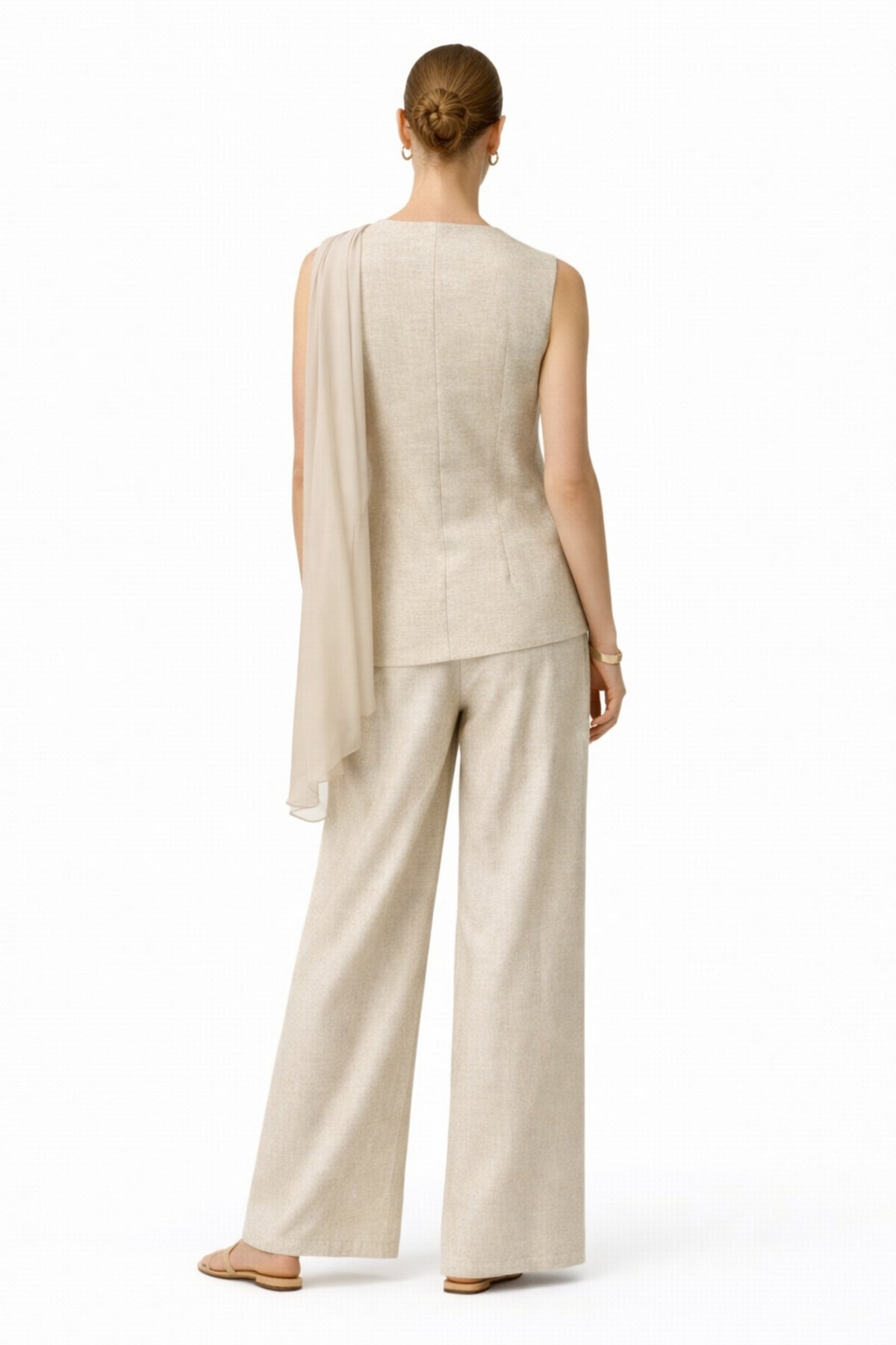 - Details: Sleeveless button-front vest, flap pockets, attached draped veil detail, wide-leg pants
